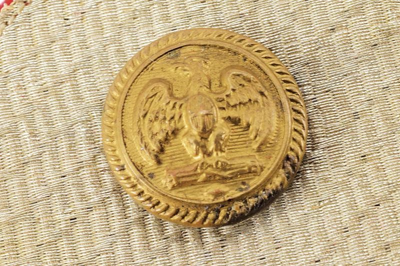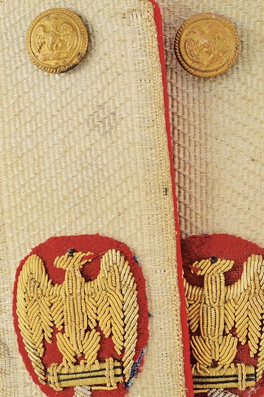 Metal plate completely covered with threads on the upper part, Roman eagle on fasces at the base, the base of the fasces made of silvered threads. Covered with red cloth at the rear side (areas with moth holes), buttons with Savoy eagle on fasces.
