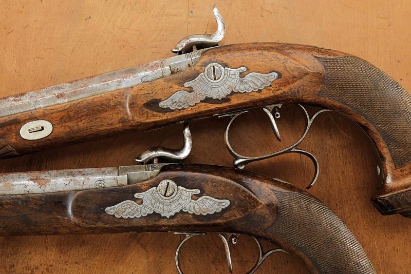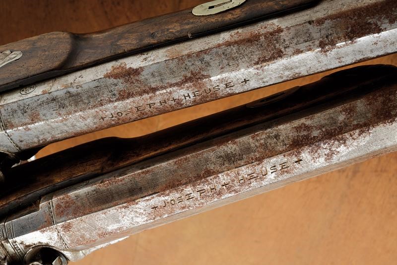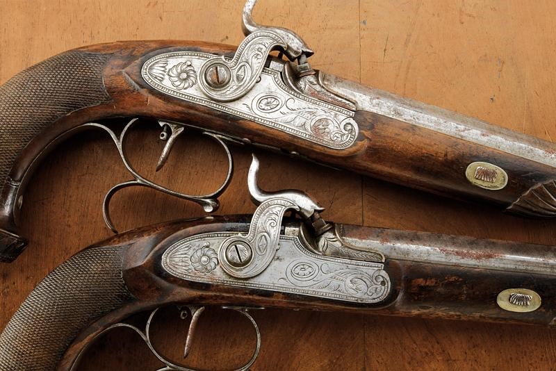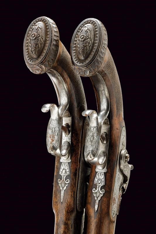 Micro-rifled, octagonal, 12 mm cal barrels, silver foresight. Tangs engraved and provided with rear sight. Percussion forward spring locks featuring lock plates engraved with floral motifs, the tangs with beautiful flowers. Wooden, half stock, fore-end caps sculpted as a shell, checkered butts, elliptical butt-plates with sculpted leaf decoration. Set trigger. Iron mounts, trigger guards with finger support and engraved with a spider web and floral motifs, butt-plates finely carved with laurel and flowers. Kept in a wooden case (missing parts) lined with burgundy cloth inside (defects and missing parts) complete with tools and powder flask.
