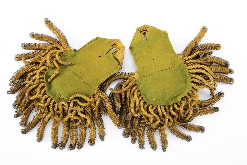 Metal-sheet plate completely covered with gilded threads; a crowned double eagle in relief at the center of the crescent, with the letters "FI" in the middle. The border with gilded-threads band and gilded threads fringes (browned areas). With green cloth lining inside (very small damaged parts).