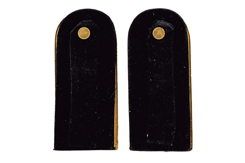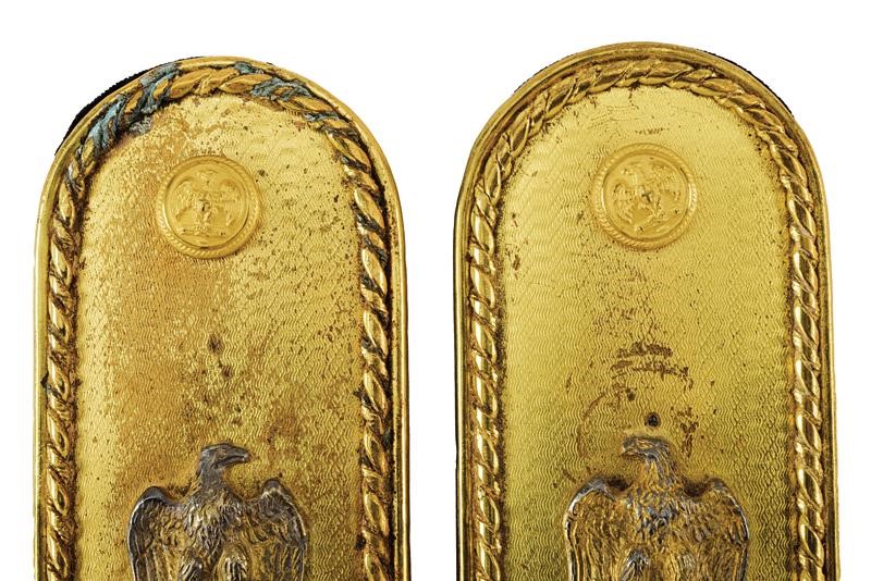 Gilded metal plate, in the centre an eagle on fasces and a star at the bottom; border in relief and roped along its entire length. Covered with black velvet at the rear side, the buttons with Savoy eagle on fasces. Small general defects.