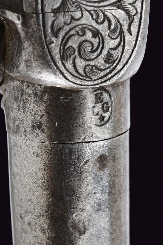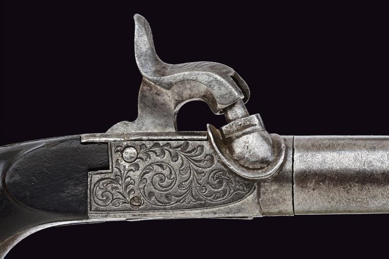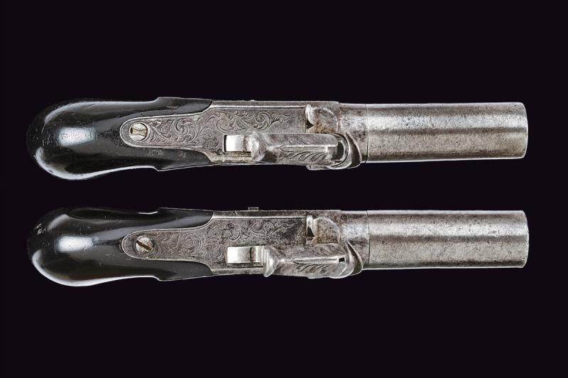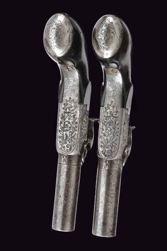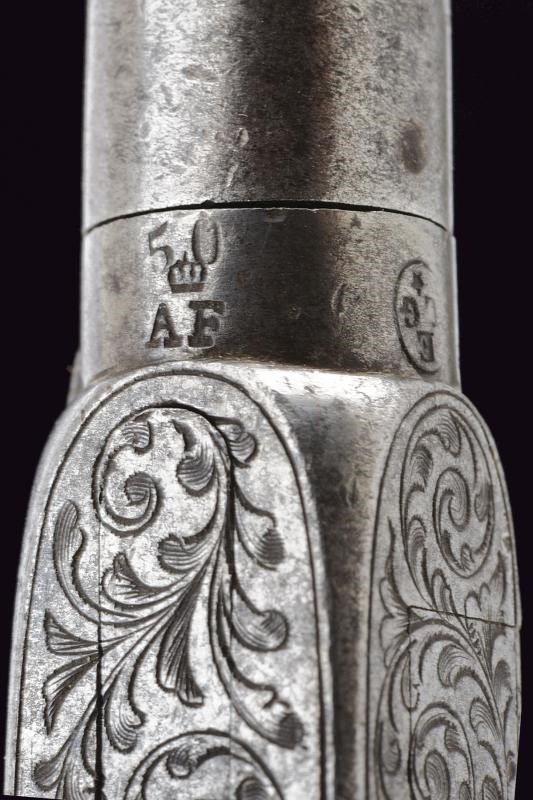 Micro-rifled, cylindrical, turn-off (locked) barrels, with traces of damask, 9,5 mm cal. at the nozzle. On the underside crowned "AF" mark and other marks including the mark of the Liège test bench. Iron boxlock frames engraved with racemes. Foldaway triggers. Working mechanism (one cock does not hold the cocking position). Smooth, ebony grips. Some pitting. Butt-plates engraved with racemes.