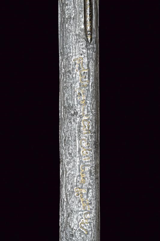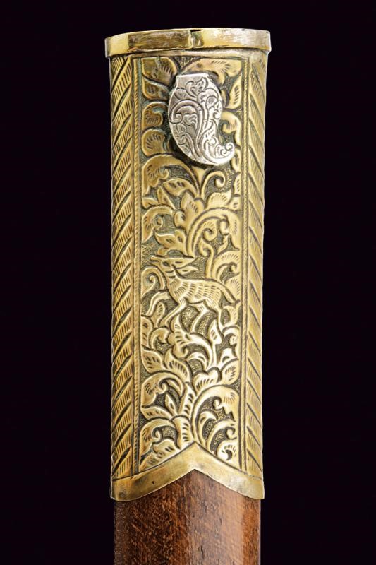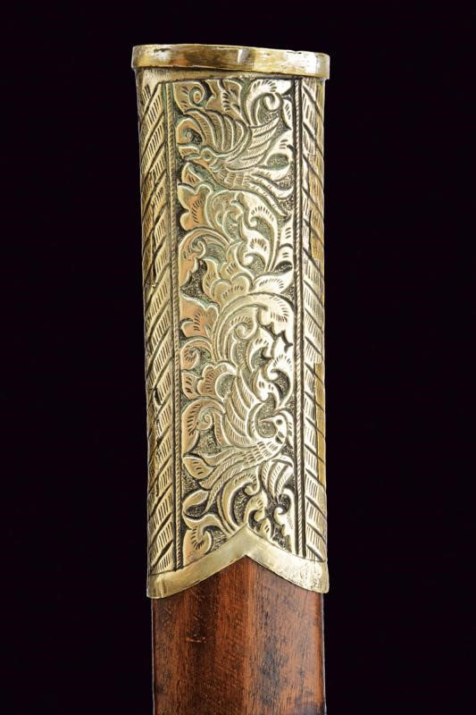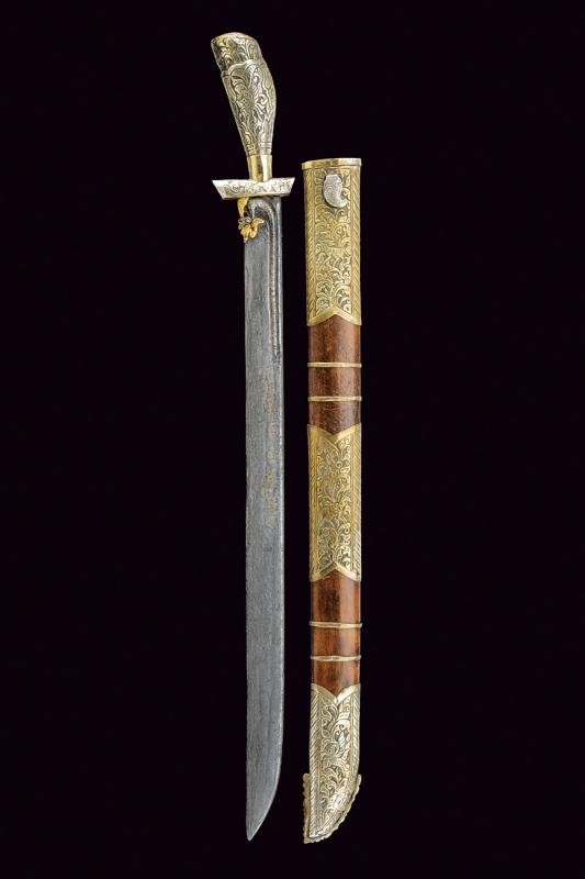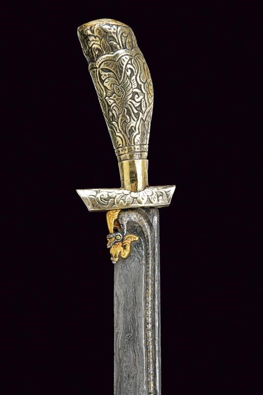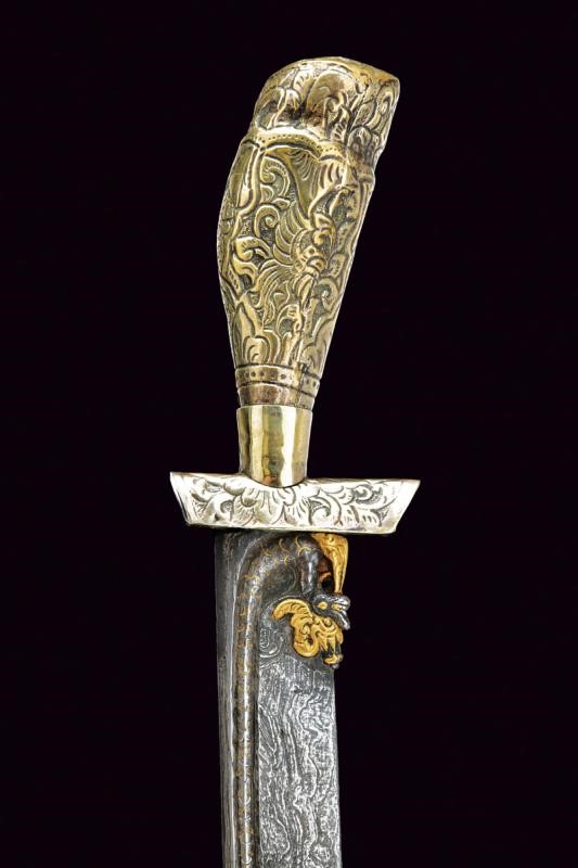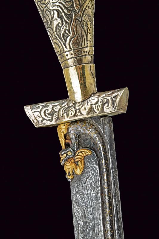 Straight, single-edged blade of fine pamor, engraved at the base, carved and pierced as a dragon with gilded brass elements, then with gold inscriptions on both sides. Mounts covered with nickel silver foil richly engraved and carved with floral and geometric motifs. Wooden scabbard, covered with nickel silver foil decorated en suite.