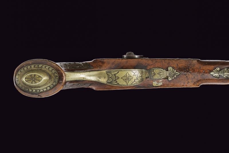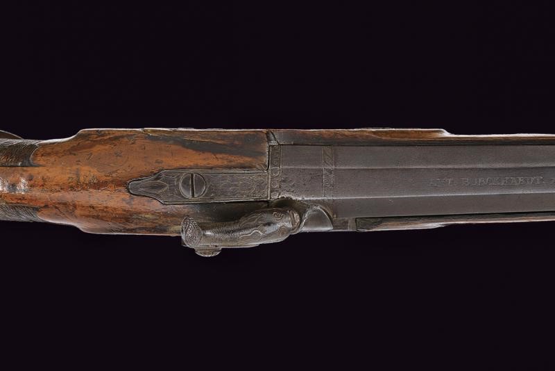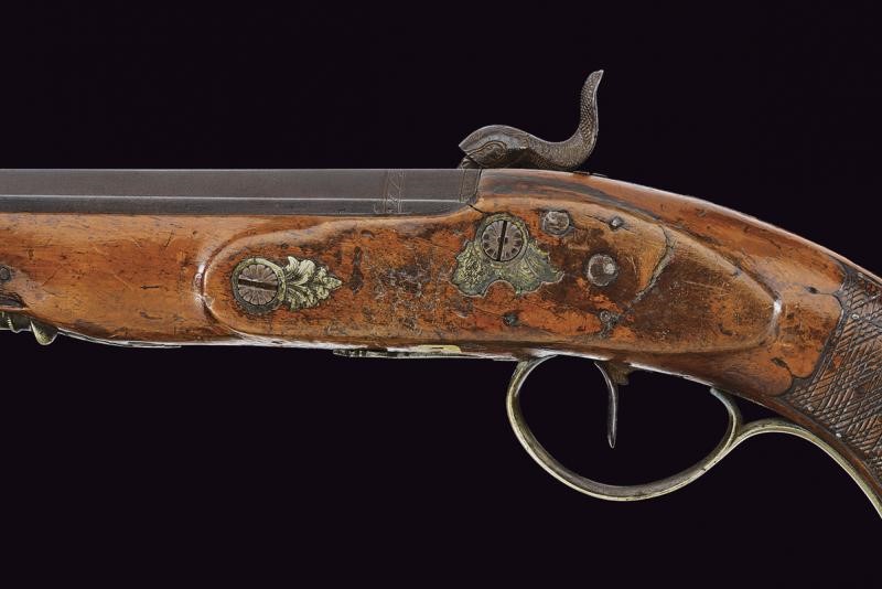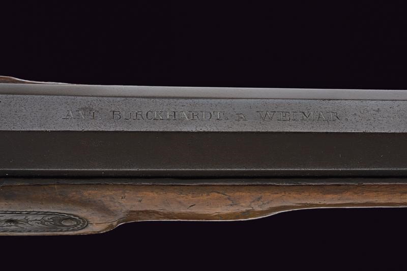 Octagonal, rifled barrel, signed "ANT. BURCKHARDT A WEIMAR", 12,9 mm cal. at the nozzle. Tang engraved with floral motifs. Lock with working mechanism and decorated with frame and engravings on the lock plate, the cock decorated with floral motifs and a lion's head. Wooden full stock (an old repair at the counter plate), grip featuring mesh checkering and remains of decorative nails. Mounts made of pewter-like metal with floral engravings. Brown-horn muzzle with small missing part. Wooden ramrod with brown-horn cartridge extractor.
