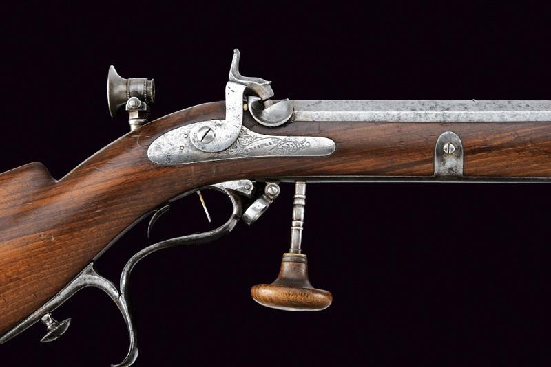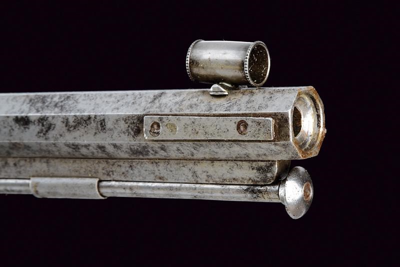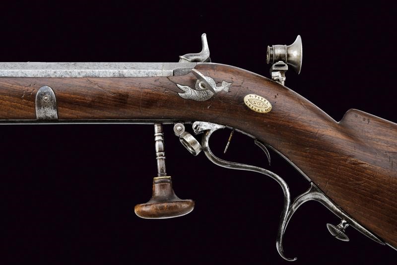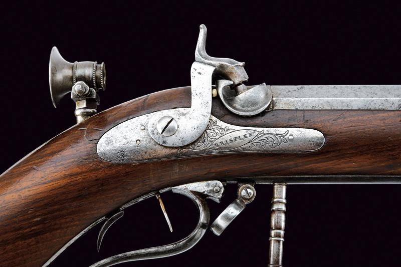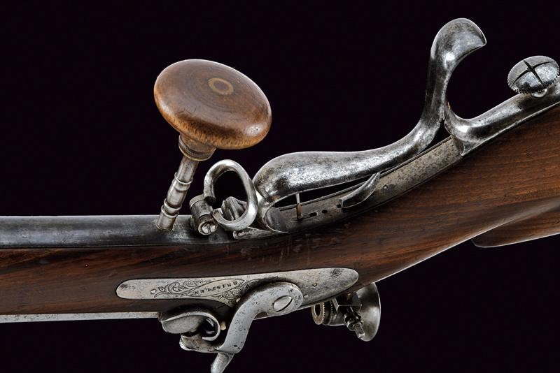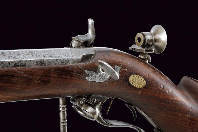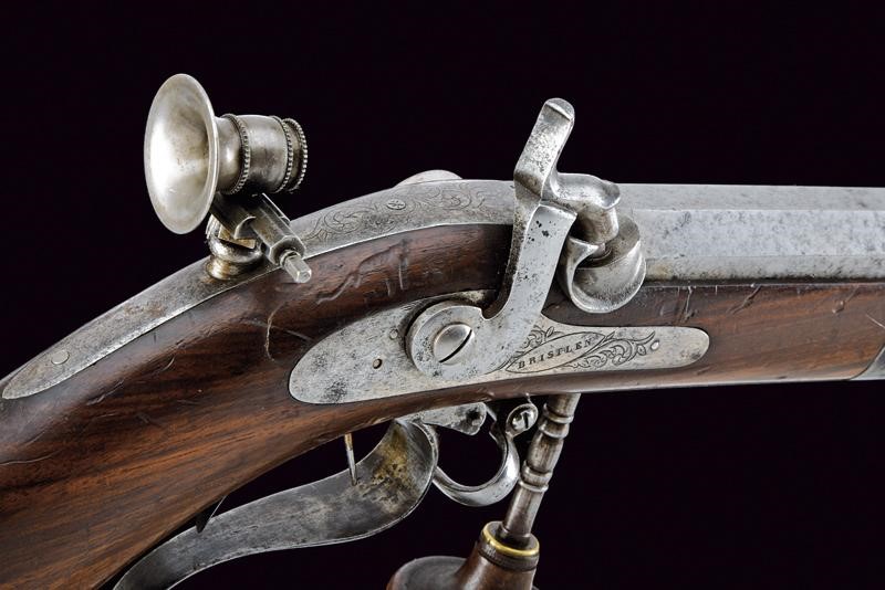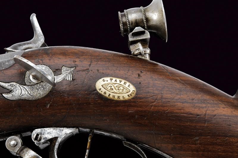 Rifled, octagonal, 11 mm cal barrel (needs cleaning) signed ‘BRISTLEN A MORGES’ at the base (breech with a missing part), provided with foresight and clutch for the bayonet. Slightly engraved tang provided with peep sight. Backward spring lock with plate slightly engraved with floral motifs, signed ‘BRISTLEN’. Working mechanism. Wooden half stock. Iron mounts. Set trigger. Quick release screws. Trigger guard with finger support, in front of it is the wooden pommel mounted on an iron support. Elliptical shield near the counterplate marked ‘G. TAVEL /A. GIMEL 1850’. Iron ramrod and brass base for the cartridge extractor.