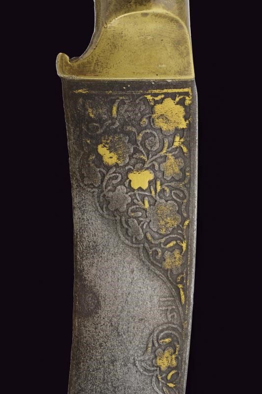 Counter-curved, single-and-a-half-edged blade, with enlarged and ribbed tip, featuring remains of gold vine-shoot inlays on a koftgari knurling at the base and at the back. Ring nut with two brass plates. Handle with deer horn grips. Probably the blade is a 18th century manufacture, the handle might be a reassembly of the following century.