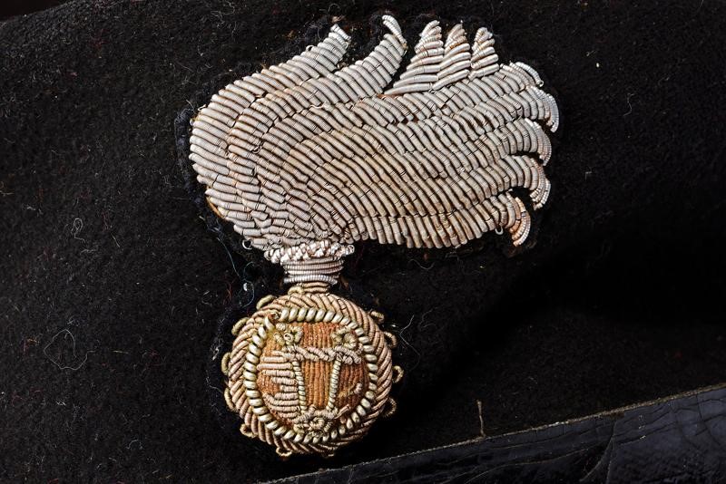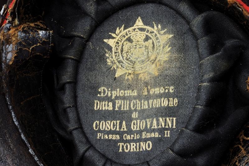 Black cloth body with red piping, front frieze representing a grenade surmounted by a silver-coloured threads "VE"; leather chin strap, plain metal buttons, leather brim. Inside sweat band (defects), fabric lining with mark "Diploma d'onore Ditta Flli. Chiaventone di COSCIA GIOVANNI Piazza Carlo Eman. II TORINO".