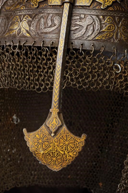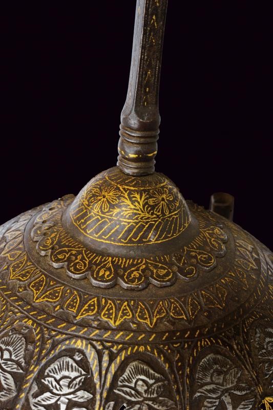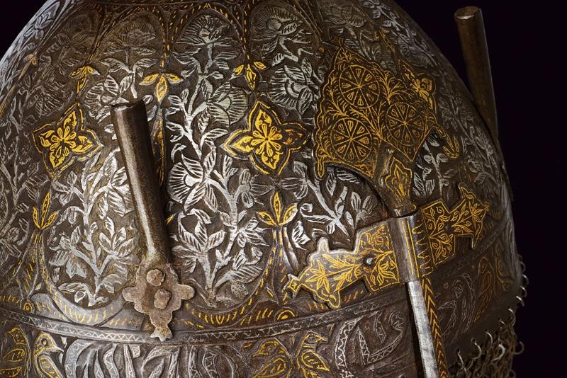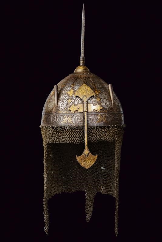Interesting oval-shaped skull with straight base provided with a long cusp of square section resting on a flower-shaped stud, sliding nasal bar finely decorated with gold geometric and floral motifs, placed between two plume-holders. The entire surface is decorated with floral motifs and gilded elements. The base with band featuring cartouches with the inscription in Arabic divided by stylised, gilded birds. Three-fringed mail neck-defense with simple closed rings.