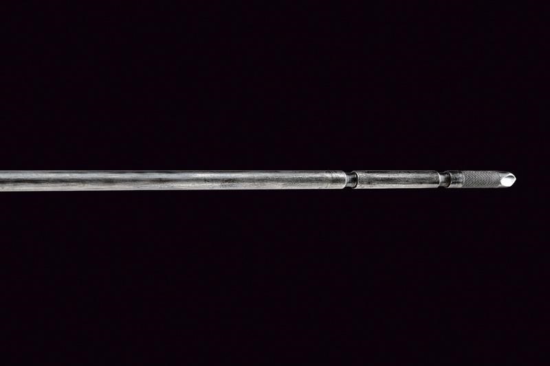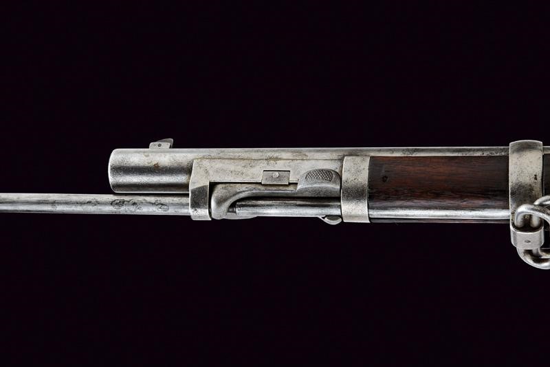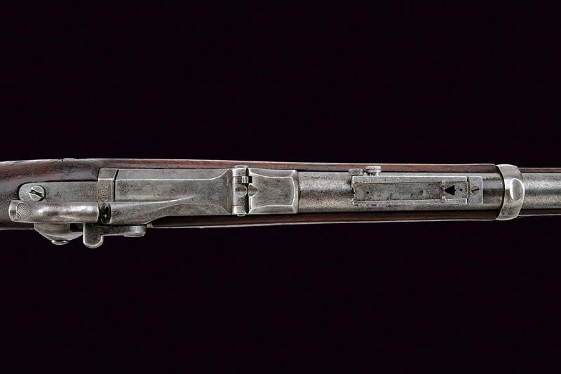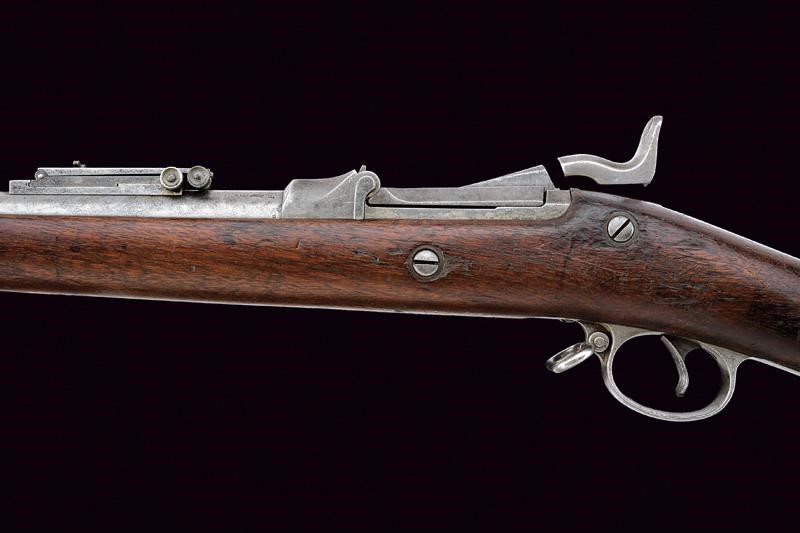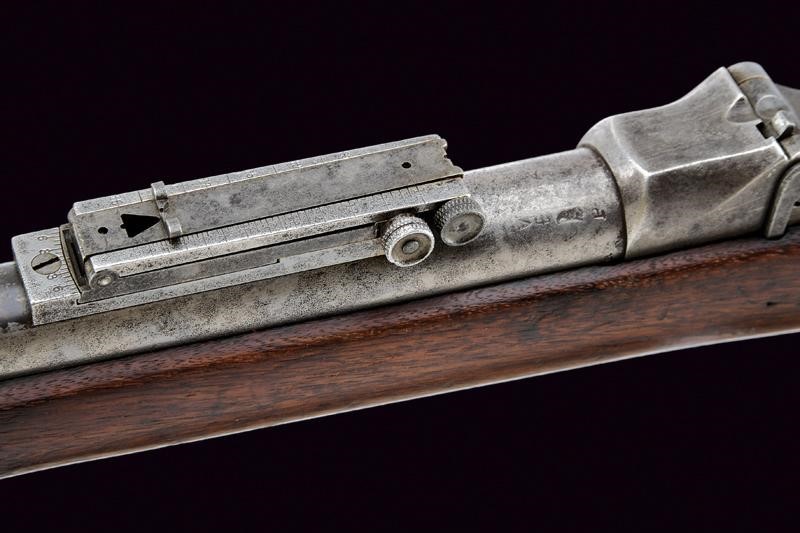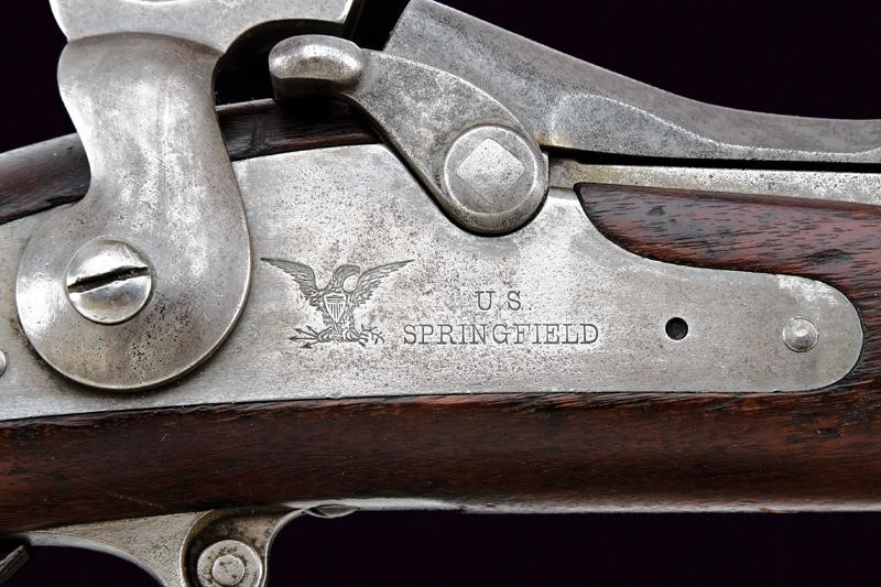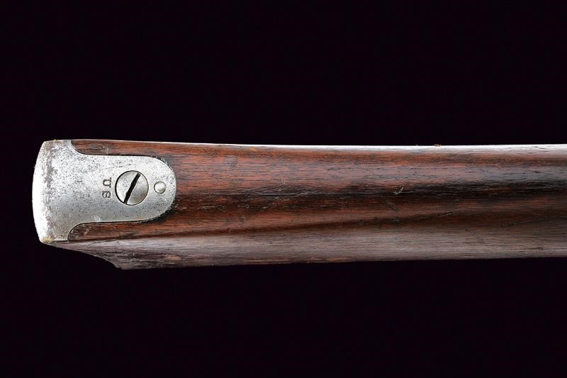 Round, rifled, 45/70 cal. barrel (a few areas of slight pitting inside, visible rifling), with foresight and foldaway and adjustable rear sight, with various marks including the letters "A", "P", eagle's head, "V" and "R". Bolt with "trapdoor" system, with remains of "U.S MODEL 1884" mark. Lock with lock plate marked "US SPRINGFIELD" alongside the US eagle. Back tang with serial number "56xxxx". Wooden, full stock marked "9B28" on the butt stock and with remains of stamps with colour now faded and no longer legible. Iron mounts. Butt plate marked "US" and with loading gate. Bands stamped "U". Some pitting. Complete with its integrated bayonet-ramrod.