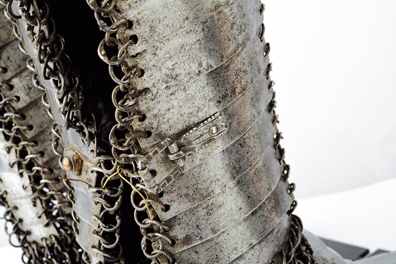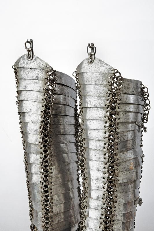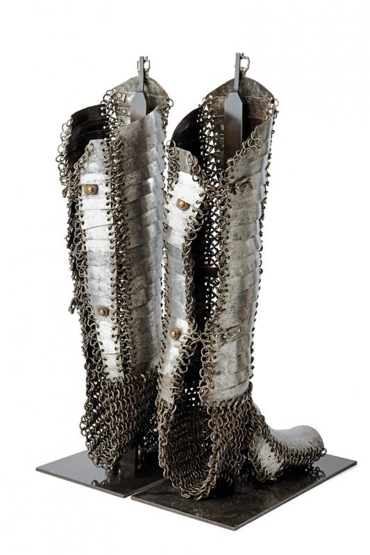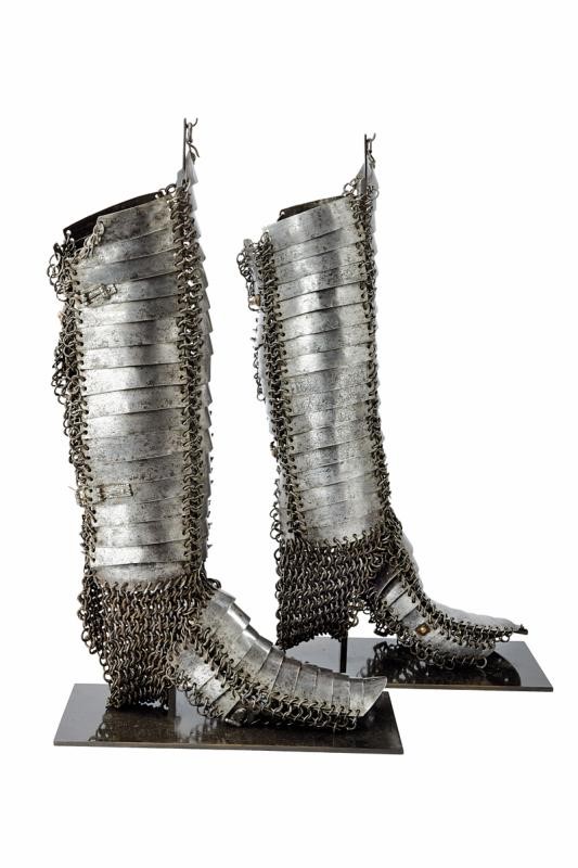 Consisting of four rows with rectangular and slightly convex plates joined by open, riveted rings; the heel protection is made of iron mail, eleven-plate sabatons featuring smaller plates at the sides, all connected by rings. Various buckles. Part of the plates engraved with floral motifs. Some rivets with remains of leather strings. On fine display stands.
