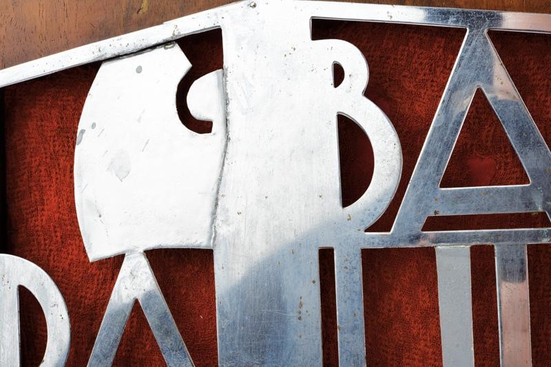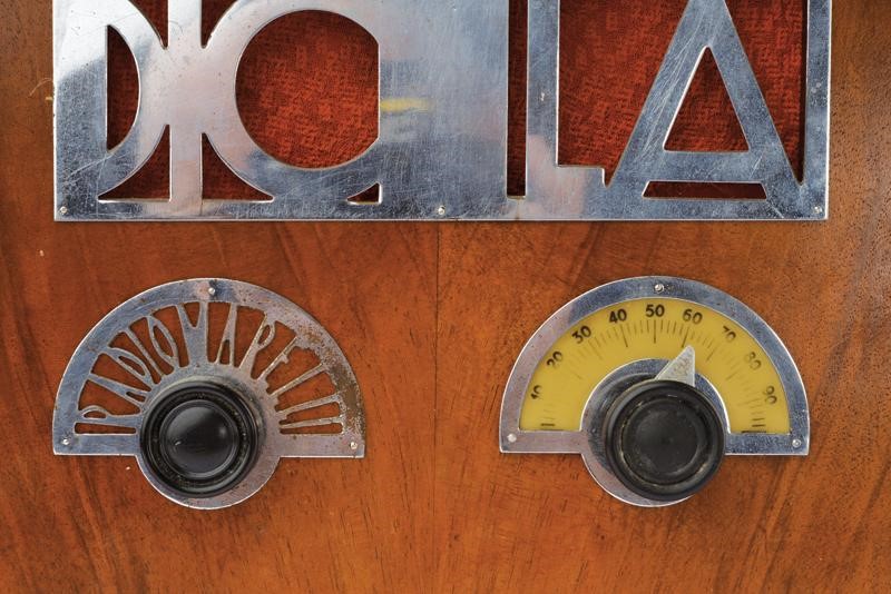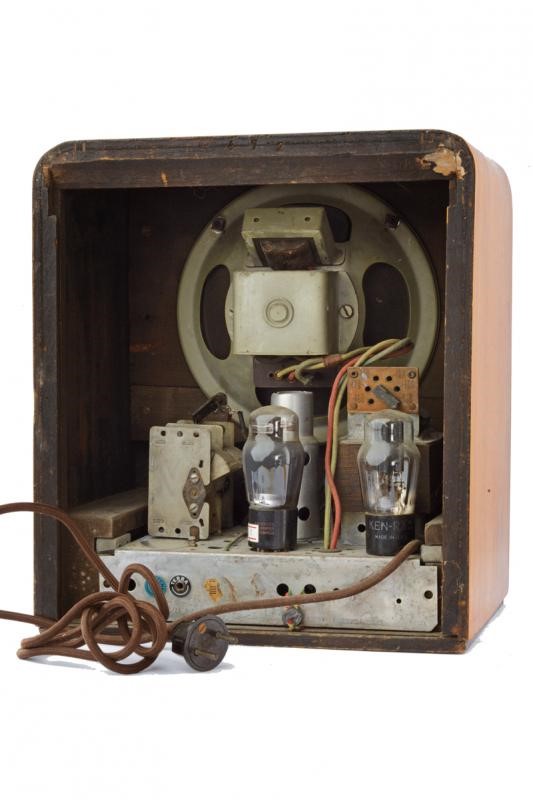 Wooden cabinet. Front frieze with restored axe and red cloth. With a lead seal of the Radiorurale authority inside, featuring a tricolour ribbon. Visible valves with English markings. Plug marked ‘D.R.G.M.’.