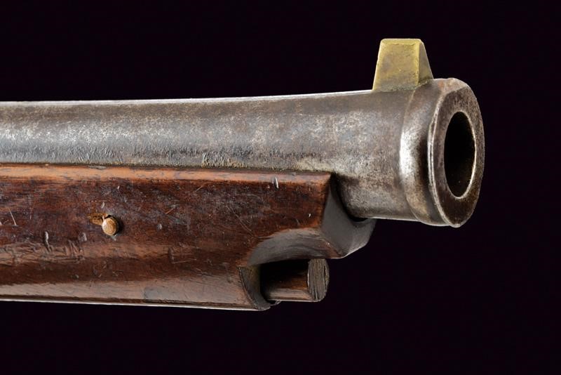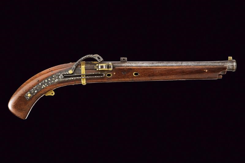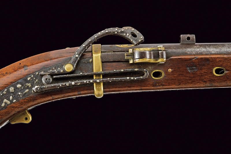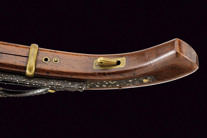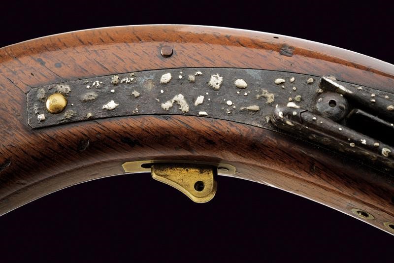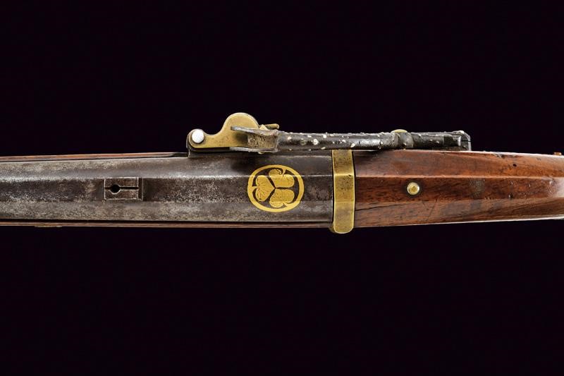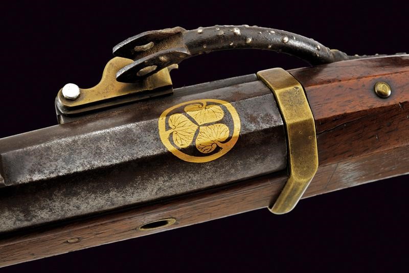 Round, smoothbore, 13.2 mm cal barrel with flat back, gilded-inlaid Mon Tokogawa at the base, rectangular rear sight and triangular, iron foresight, moulded muzzle (a small defect). Fine match lock with plate, hammer and spring decorated with differently shaped elements made of silver and resembling a rocky/metoerithic surface, iron pan and movable brass pan cover. Full stock of typical shape (small defects). Wooden ramrod. Working mechanism.