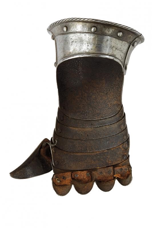 Made of iron. Smooth cuff with small embossed decoration, lowered edge with twisted border. Four-plate gauntlet, knuckle plate with deep oblique grooves. Two-scale thumb.