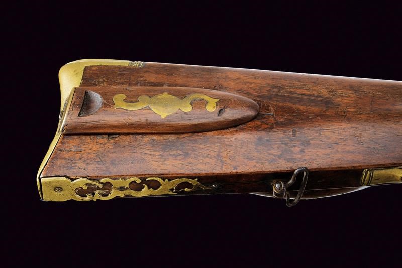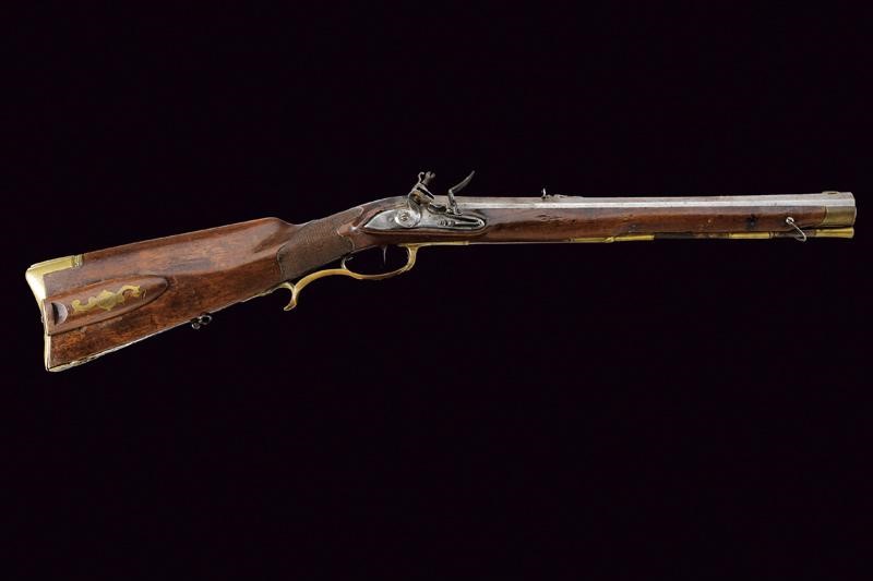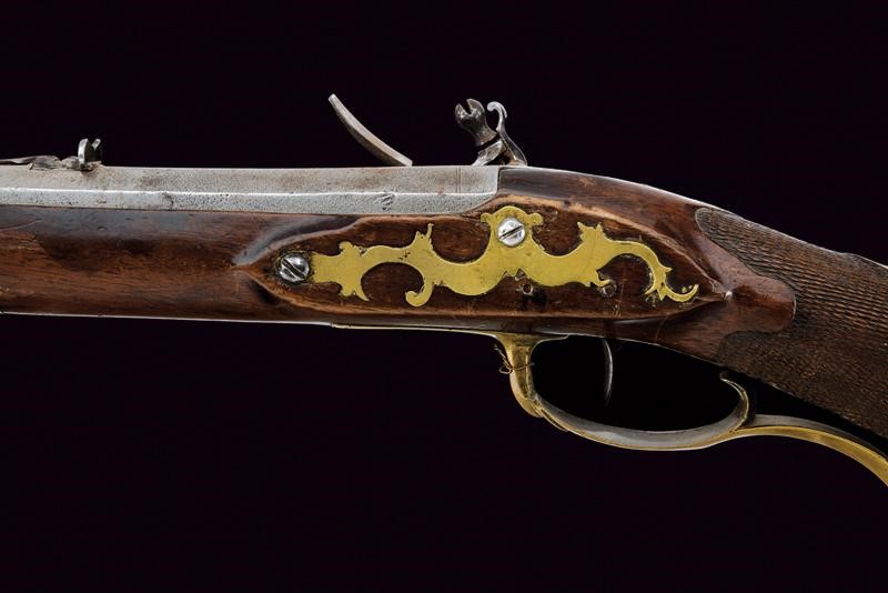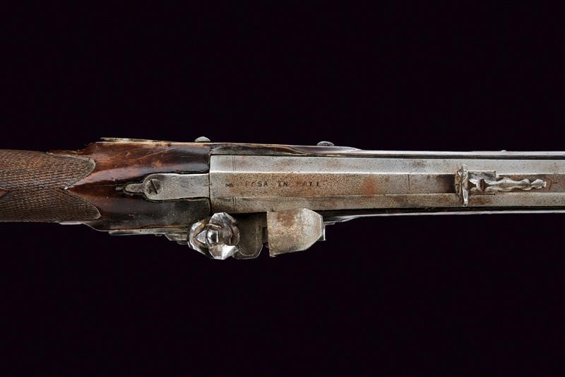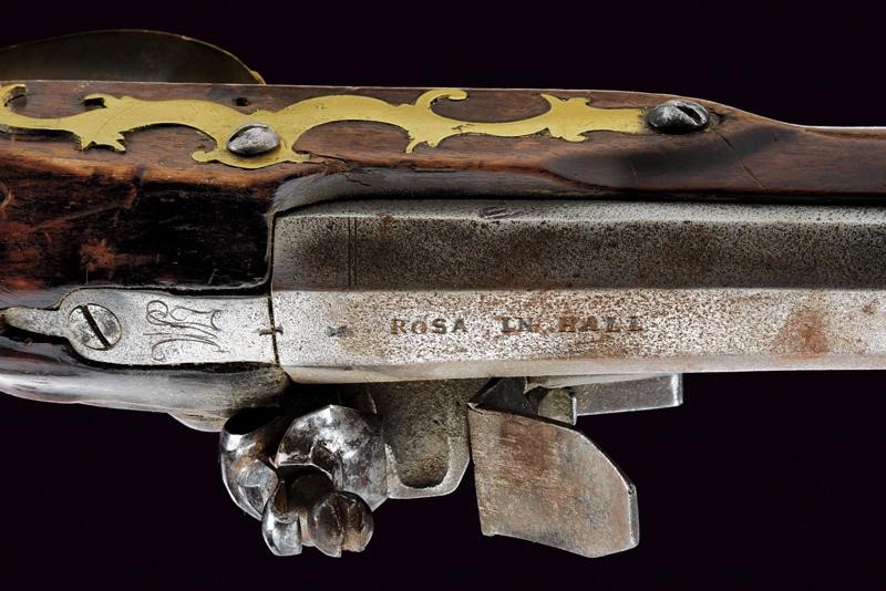 Octagonal, rifled, 15 mm cal barrel, provided with fixed foresight and rear sight, with remains of outlining and featuring the signature "ROSA IN HALL". Flintlock with working mechanism. Wooden full stock (some restoration) with knurled handle. Brass mounts. The butt with patchbox provided with (relevant?) lid marked "LL" inside. Brass-tipped, wooden ramrod with iron cartridge extractors.