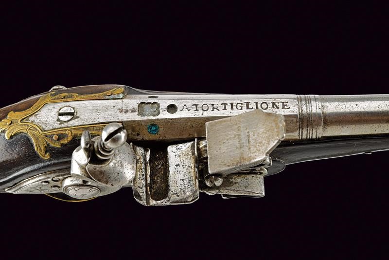 Smoothbore, two-stage, 12 mm cal. barrel, octagonal at the first part with deep mark between three circles, signed "A TORTIGLIONE", then round after rings; lock with flat lock plate with oblique borders signed "PIETRO TOMASI", engraved with grotesque figures and a bird; batterie carved and engraved, sliding pan cover. Wooden full stock with brass mounts engraved with floral motifs. Butt-plate with mask in relief. Brass-tipped, wooden ramrod.