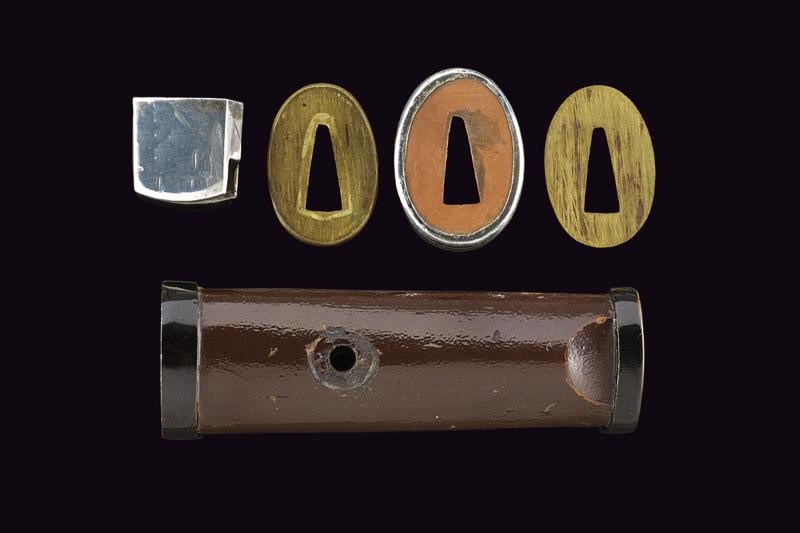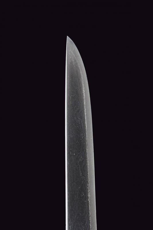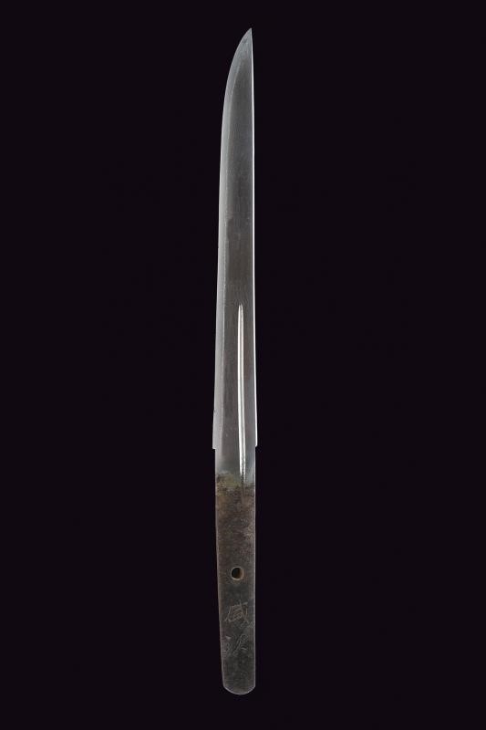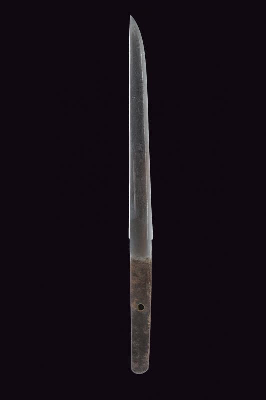 Nagasa (length: 17.6 cm). Hada: O Itame; Hamon: Suguha Nie Deki; Habaki in silver. Horimono: Hi. Nakago mei: Mori Tsugu; O-Machi Okuri Ha Agari Kurijiri, a mekugi-ana. Wooden koshirae, tsuba of brass with silver border. Saya with silver Kurigata shaped as a dragon's head and partially gilded horn Kashezuno decorated with a flower. Blade of late Kamakura period/early Muromachi.