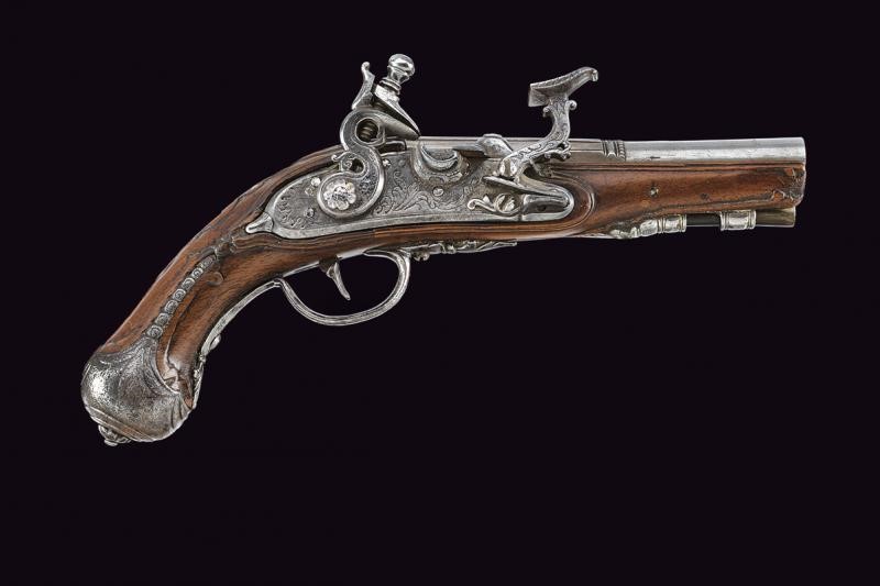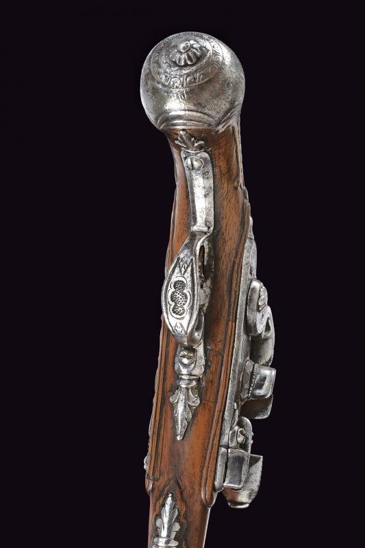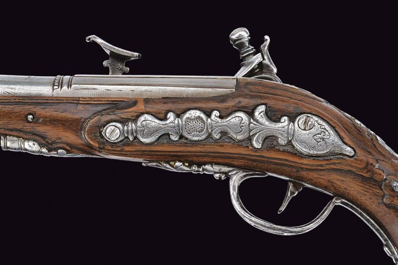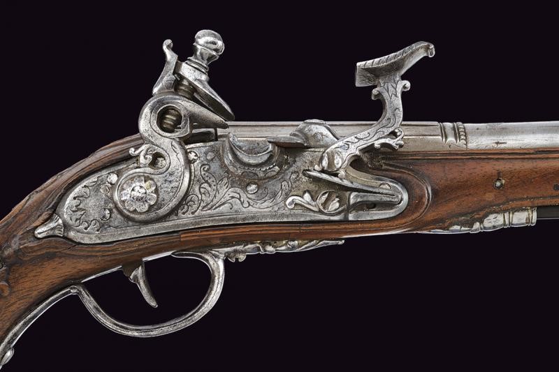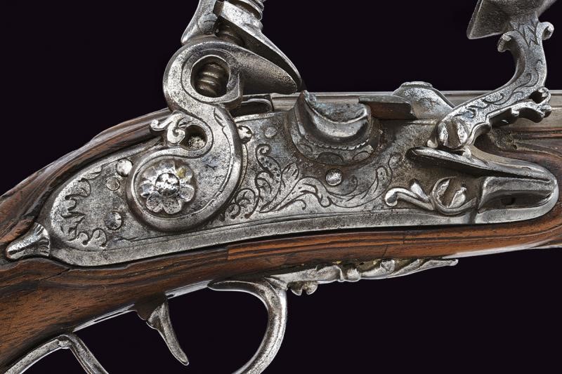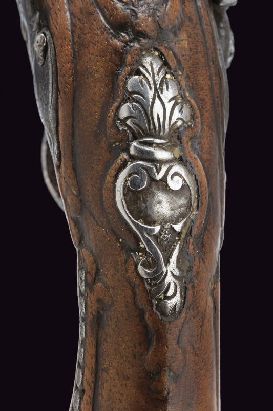 Smoothbore, two-stage barrel, octagonal at the first part, with longitudinal ribs at the corners, then round, with rings at the girdle, 11.4 mm cal. at the nozzle. Lock with flintlock mechanism and flat lock plate engraved with floral motifs. Mechanism is working but needs revision (the internal arm does not reach the base of the pan cover, which cannot be closed; the snap spring is weak). On the back of the lock plate is a signature not clearly legible (perhaps G Vallini...). Wooden full stock with repairs and restorations. Engraved and carved iron mounts. Some pitting. Ramrod made entirely of horn.