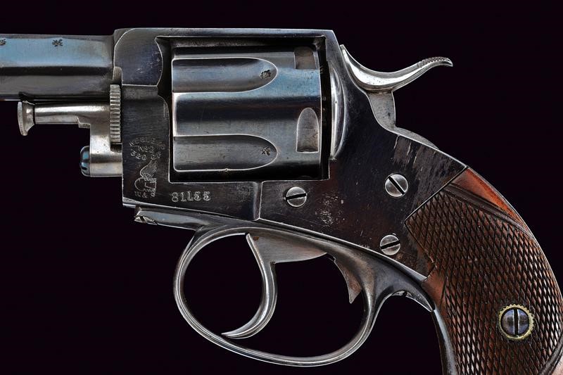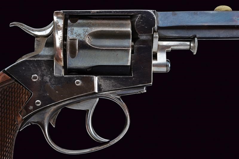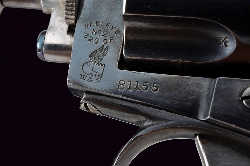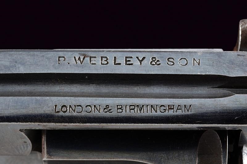 Round, rifled, 350 cal center fire barrel, provided with foresight. Clean bore, visible rifling. Six-shot cylinder, mechanism working in single and double action. On the left side the Webley marking, serial number "81xxx", the calibre marking and "W&S" surmounted by drawing depicting a winged bullet. On the back the dealer's mark "P. WEBLEY & SON / LONDON & BIRMINGHAM". Checkered, wooden grip scales. Marks of the test bench on the barrel and on the cylinder. Earlier browning..
