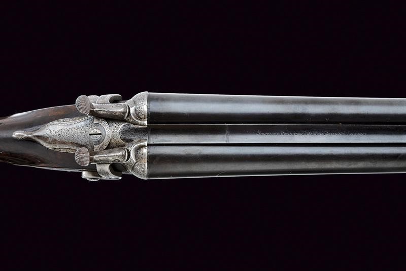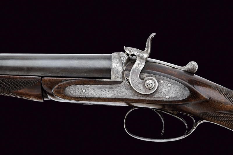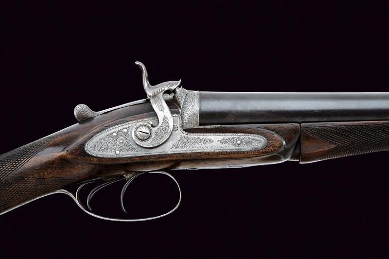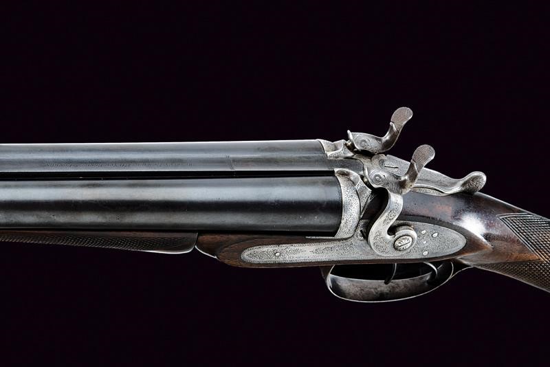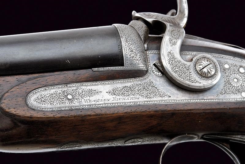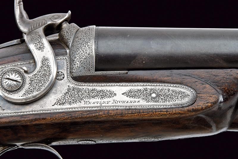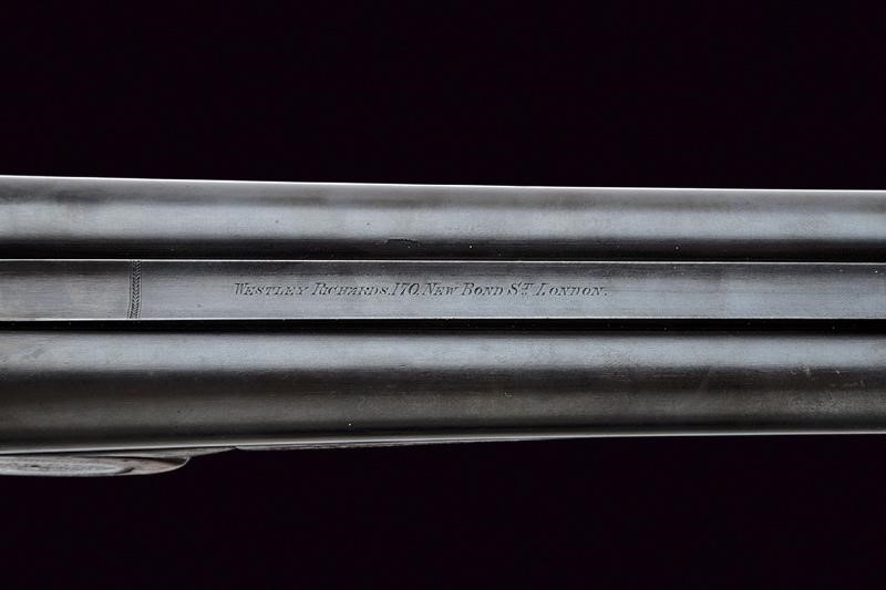 Smoothbore, round, 12 cal barrels (clean bore), provided with rib marked "WESTLEY RICHARDS 170 NEW BOND ST. LONDON". On the lower side marks of the Birmingham test bench. Probably rebrowned. Receiver with Westley Richards patent and finely engraved with racemes. The key with remains of browning. Spring lock engraved with racemes and signed "WESTLEY RICHARDS". Outer cocks engraved en suite. Working mechanisms. Wooden stock of archaic type, the fore-end is separated to allow the barrel swivelling. Both elements are checkered. Iron trigger-guard engraved en suite. Wooden, extended butt plate.