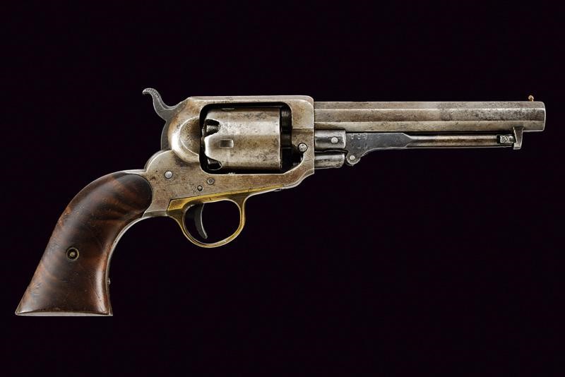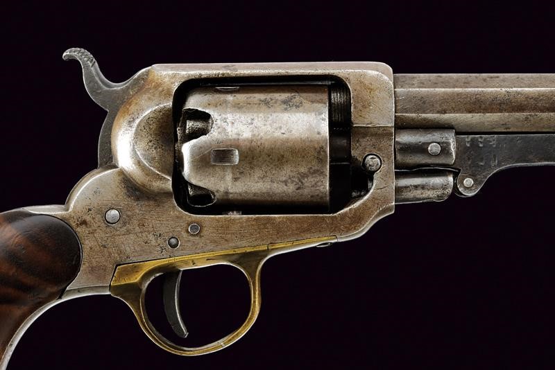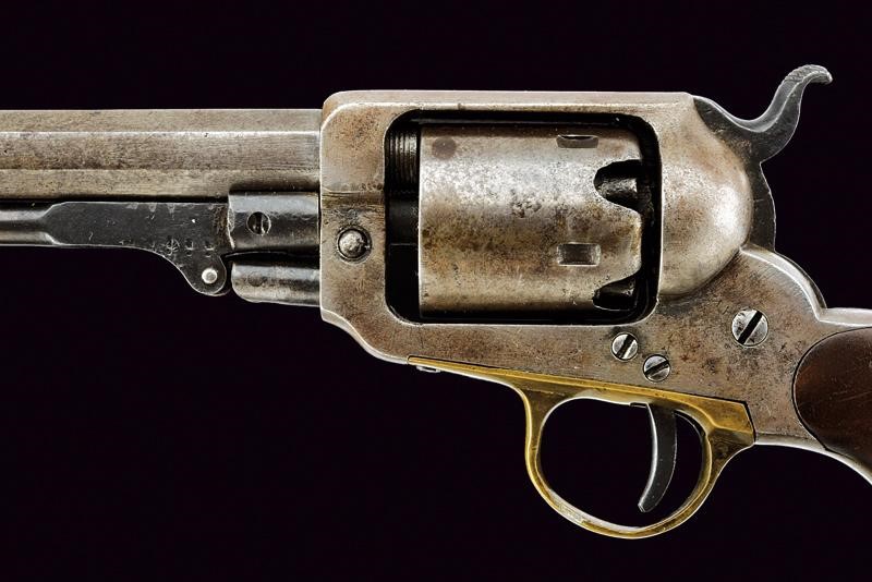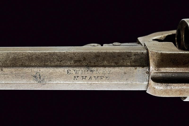 Octagonal, 5’, rifled, 31 cal. barrel (visible rifling, pitting), featuring at the back the two-line mark “E. WHITNEY / N. HAVEN”, replaced foresight. Smooth, five-shot cylinder. Working mechanism. Iron frame with brass trigger guard. Barrel and cartridge rammer with matching serial numbers.