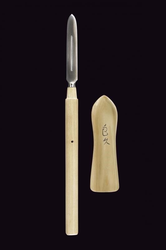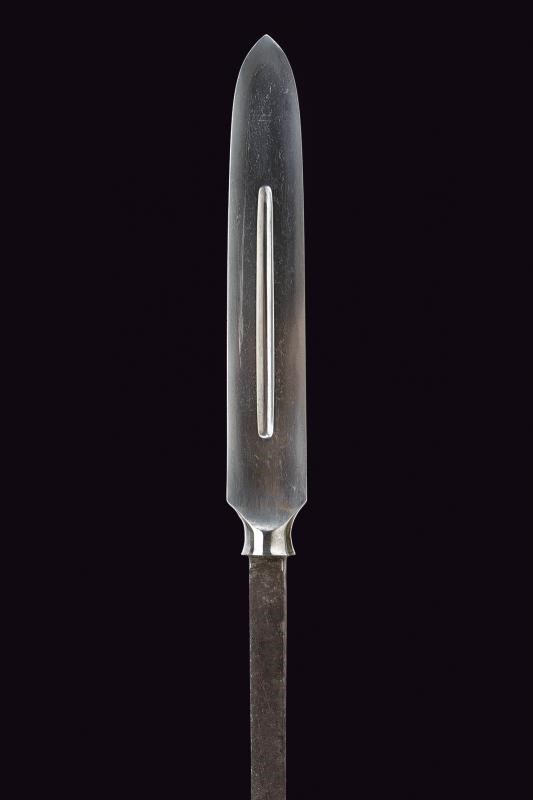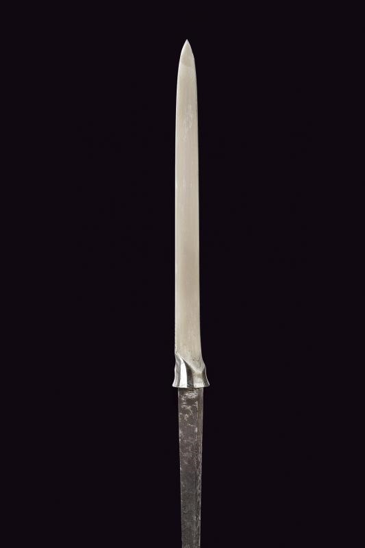 Blade of triangular section with a flat base and a central groove. Long tang with two mekugi-ana, mei: Monju Kane Hisa Saku Musashi 1688. In modern shirasaya.