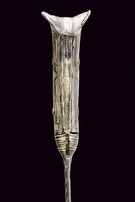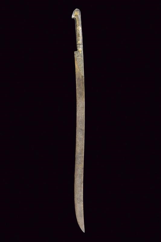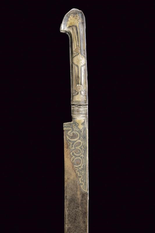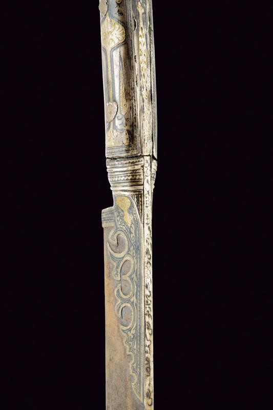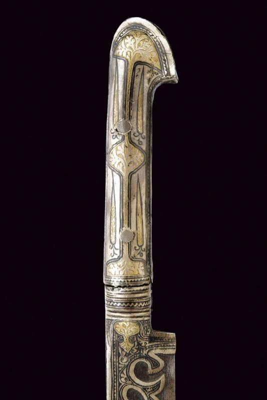 Slightly counter-curved blade with slightly hollow faces, featuring a circular mark on the left side. White metal hilt with silver-coloured elements and nielloed engravings. The back of the blade with silver-coloured metal sheet featuring a long inscription in Arabic characters with niello remains. Without scabbard.