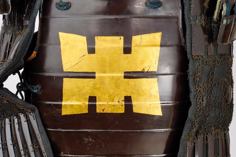 Zunari kabuto made of black lacquer with four-plate shikoro; the third one with red lacquer (perhaps to indicate the rank), four-plate Shikoro with damaged lacing. Hanbo. On the front side a large maedate kuri-hangetsu (crescent moon). Yokohagi-okegawa do decorated with golden kamon used by the Aoki clan (Han of Asada in Settsu province (modern Osaka prefecture). The armour is complete with sode, kote, haidate and suneate. All matching elements made of black lacquer and blue lacing. Accompanied by a gusoku-bitsu. Dummy not included. Era: late Edo period, circa 1800. Later maedate and gusoku-bitsu.