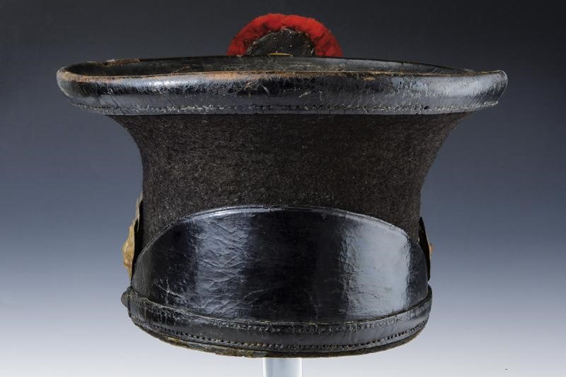 Rigid body made of thick black felt with black leather visor and nape-guard, front frieze shaped as a grenade with flame and with pierced "6", original blue cotton cockade, large red wool tassel with embroidered number, cheek-pieces and brass chin straps with scales (one scale missing). The interior is missing.