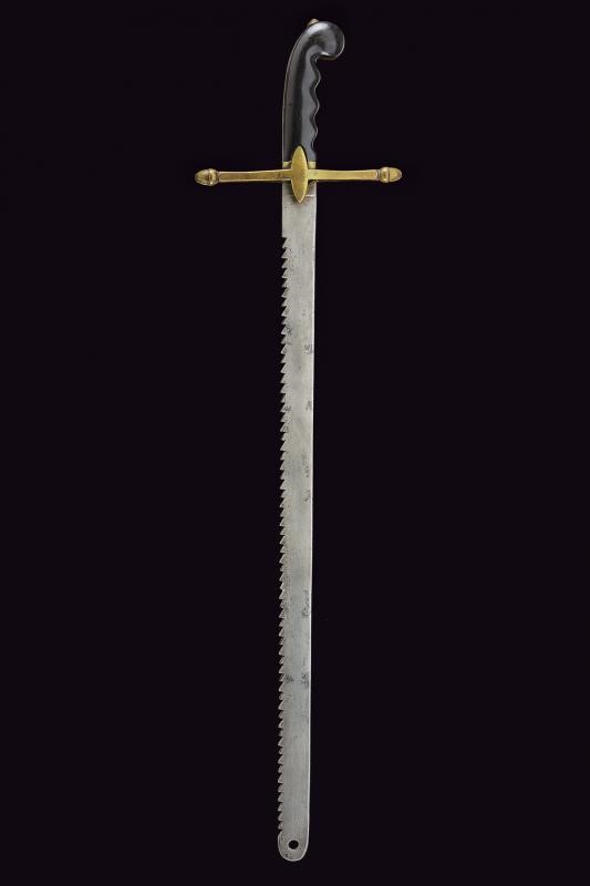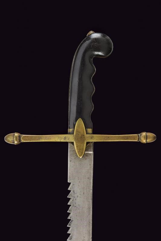 Wide, straight, single-edged blade with saw back, with rounded and pierced tip. Brass hilt with straight quillons with acorn head, elliptical langets and long smooth cap; anatomically shaped ebony grip. Missing scabbard. Rare.
