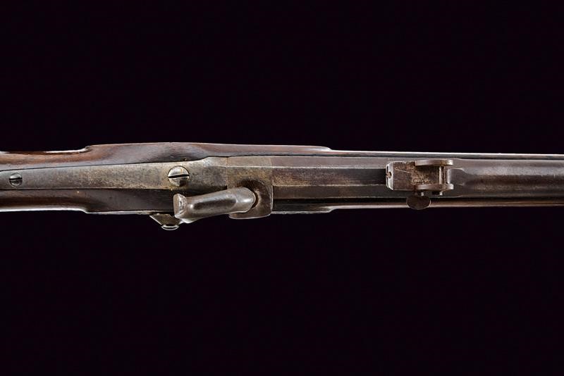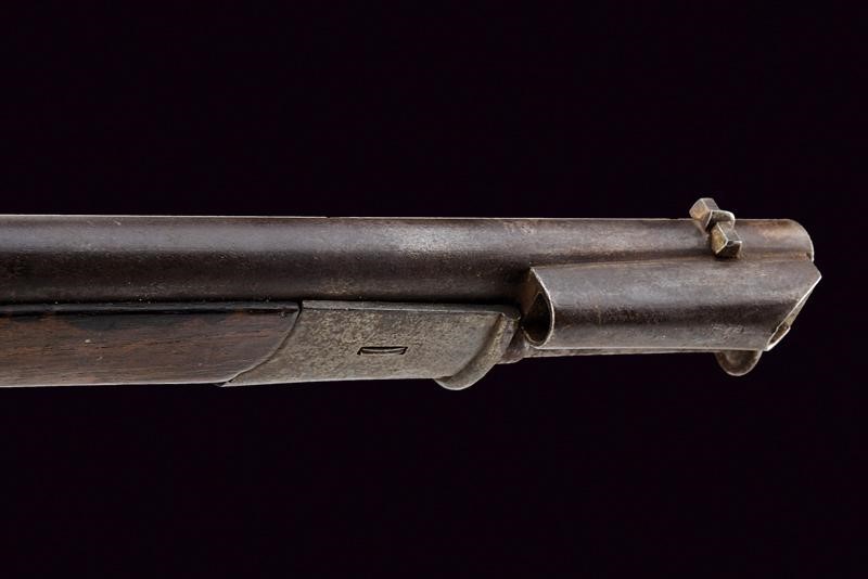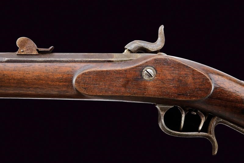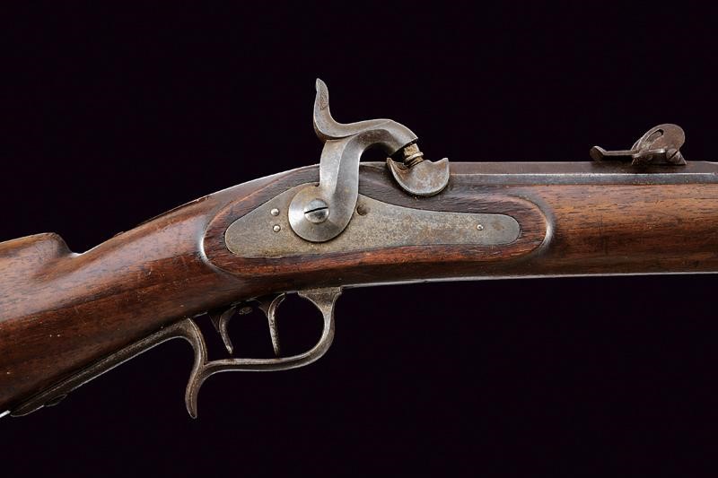 Rifled, round, 10 mm cal. barrel, octagonal at the base, with adjustable rear sight and foresight and clutch for the bayonet; long, smooth tang. Iron mounts and ramrod. Set trigger. Trigger guard with finger support. Leather strap. Together with iron bayonet.