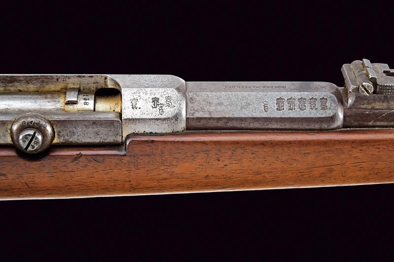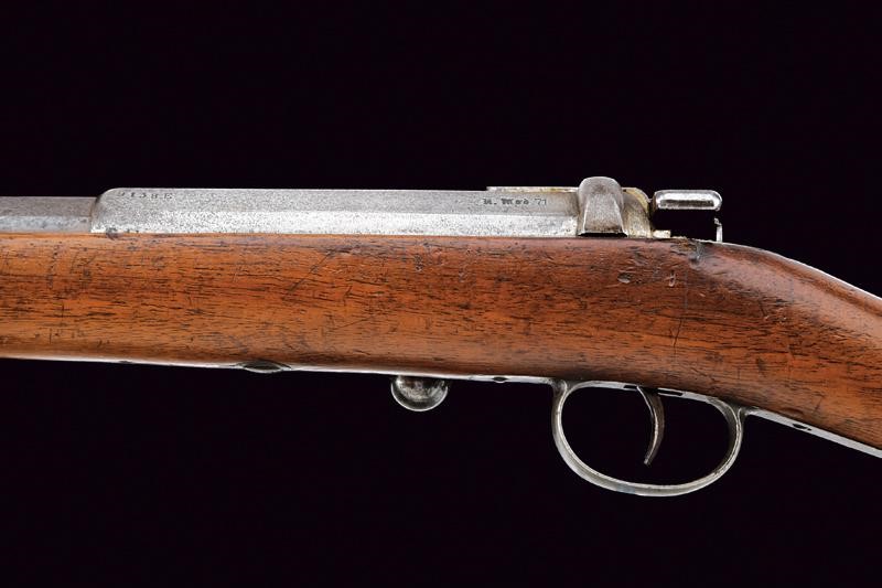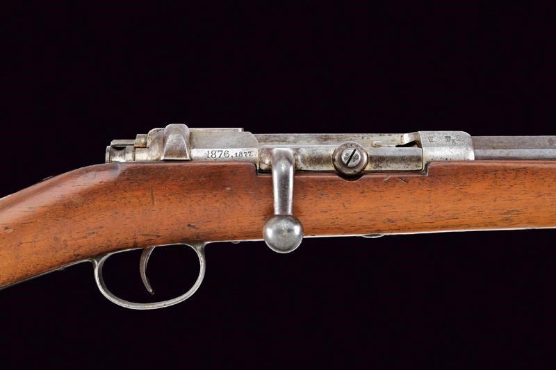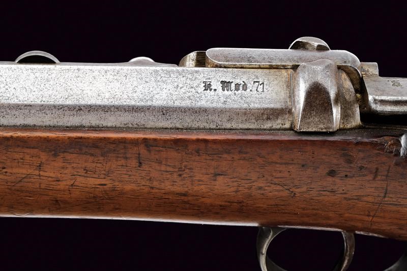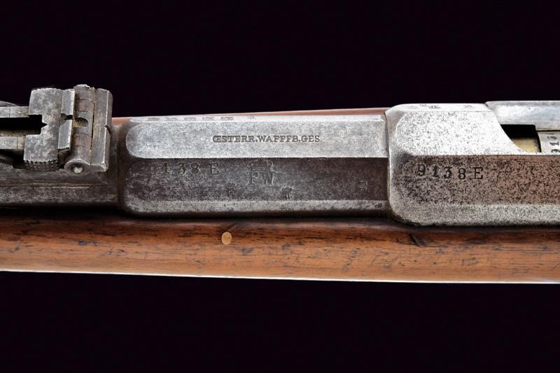 Round, rifled barrel (clean bore, slightly encrusted only at the nozzle, clearly visible rifling), with octagonal breech, provided with foresight on the muzzle ring, with adjustable, foldaway rear sight, marked "OESTERR.WAFFFB.GES.", also featuring several German marks and the crowned monogram "FW". 10,8 mm cal. at the nozzle. Sliding-revolving bolt with frame marked with model inscription and dates "1876.1877", also featuring various marks. Working mechanism. Wooden full stock with crowned "FW" stamping on the butt stock and other stamps on the lower side. Iron mounts. Matching serial numbers repeated on various elements.