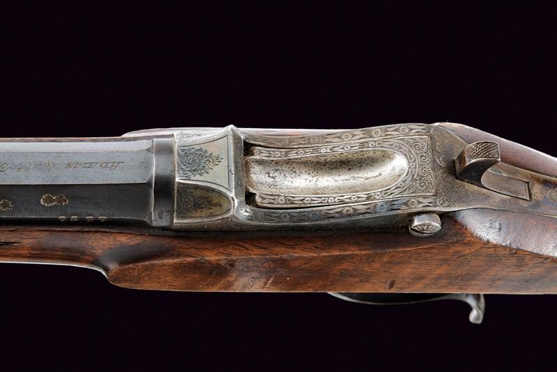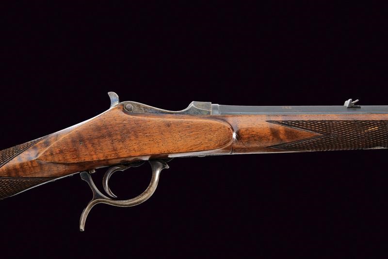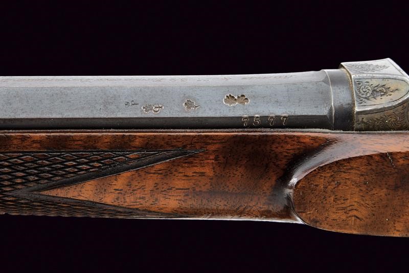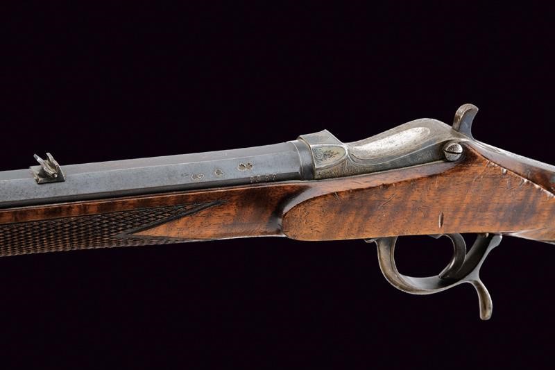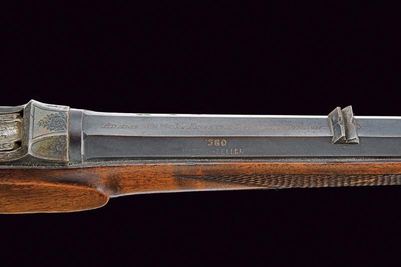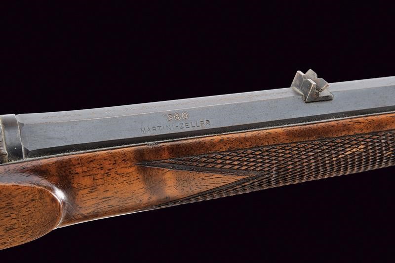 Rifled, octagonal barrel, with foresight and rear sight with foldaway and sight leaf adjustable in two heights, marked "ADAMS & Co. 32 FINSBURY PAVEMENT LONDON", featuring the mark of the London test bench and calibre inscription "360. MARTINI-ZELLER". Clean bore with some signs of use, visible rifling. Remains of old bluing. Falling block martini type bolt. Back with frame and raceme engraving, featuring remains of casehardening. External comb of the cock for manual firing pin. The trigger guard, provided with a scroll, serves as a cocking lever. Walnut half stock with checkered fore-end and grip. Iron mounts engraved with racemes en suite. Brown horn fore-end.