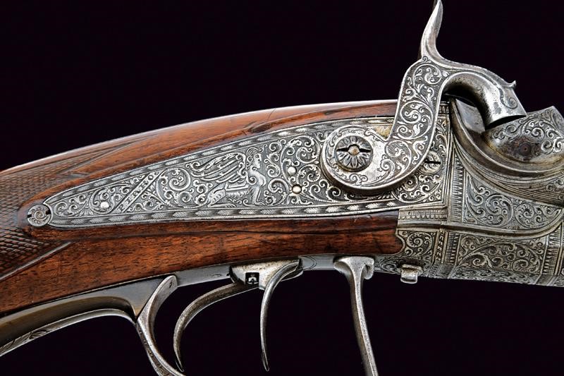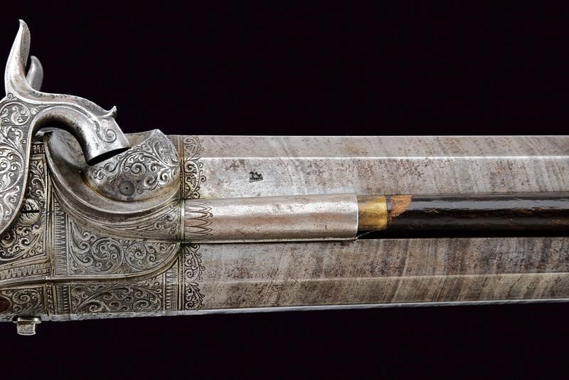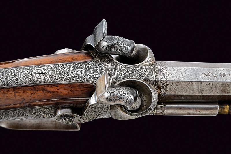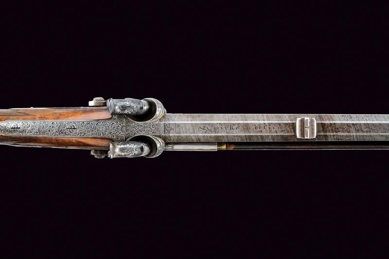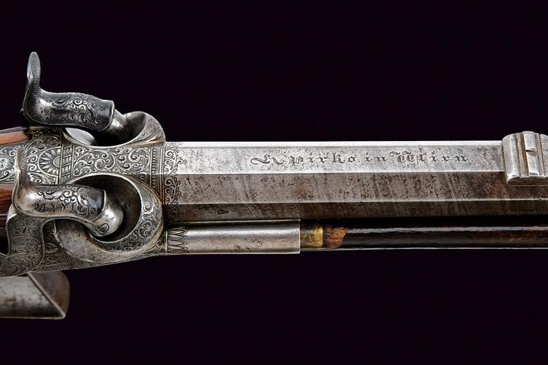 Twisted, octagonal, rifled barrels, the upper one provided with fixed foresight and fore-end, signed "PIRKO IN WIEN". 15,5 mm cal. at the nozzle. With stamp "52", mark of the Liège test bench, and mark "J.D." on the left side. The breech block provided with the two pistons and a wide, rounded base and spark arrester; the surface engraved with racemes on a dotted background. Dorsal tang finely engraved with racemes. Backward spring locks engraved with effigies of sphinxes, cartouches "PIRKO / WIEN", frame in the margin and racemes in the background. Cocks engraved en suite. Well working mechanism. Walnut butt with grip featuring remains of checkering, butt stock with cheekpiece and patchbox with leaf-carved lid and iron plate engraved as the blades. Engraved iron trigger guard with carved horn end. Iron smooth butt plate. Two triggers, the right one with adjustment screw. In front of the trigger guard is an adjustment nut, probably for the second trigger. Wooden ramrod on the right side, with brass mounts.