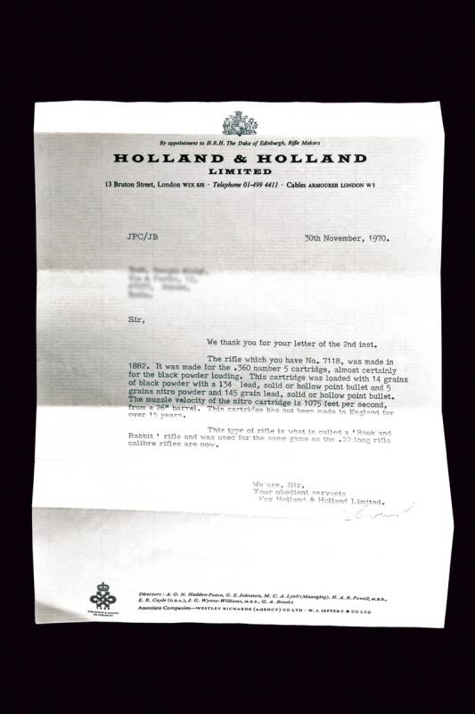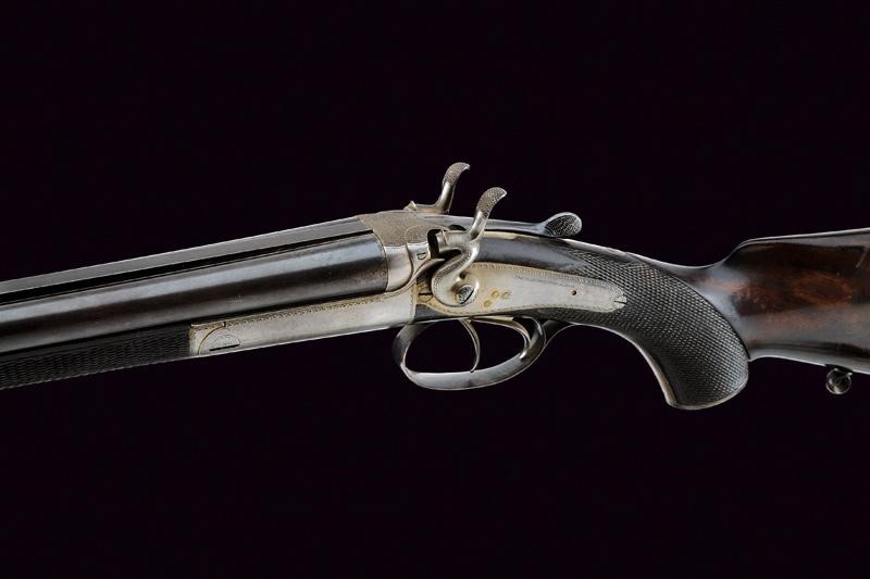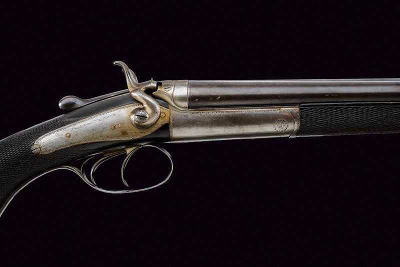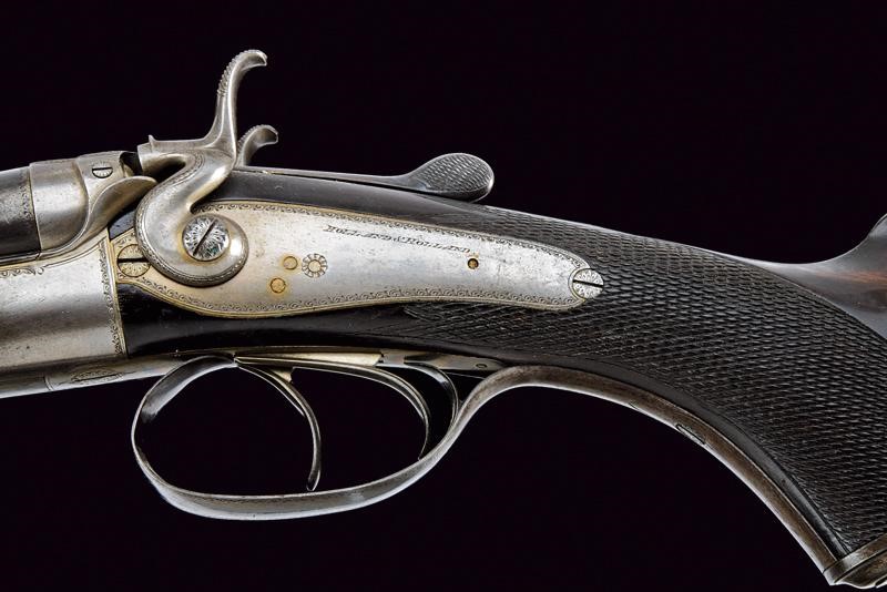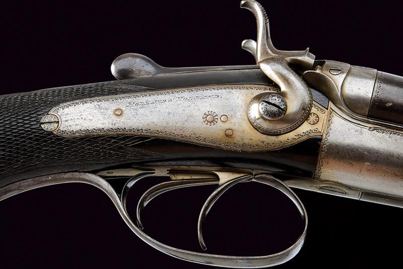 Round, rifled barrels (visible rifling, small signs of use and slight pitting inside), featuring the mark "HOLLAND & HOLLAND / 98 NEW BOND ST. LONDON", 9,2 mm cal. at the nozzle. Partially checkered back rib provided with foresight and rear sight with sight leaves adjustable in three heights. Marks of the London test bench at the bottom. Steel receiver decorated with leave-shaped frames, the back with granulated decoration to prevent reflections. Backward spring locks signed "HOLLAND & HOLLAND" and engraved en suite. Bouncing cocks, well working mechanism. The key with opening lever featuring remains of antique bluing. Walnut butt and fore-end, both with checkered segments. Steel mounts. Trigger guard with remains of antique browning. Butt plate with checkered segment. White metal shield under the butt stock.