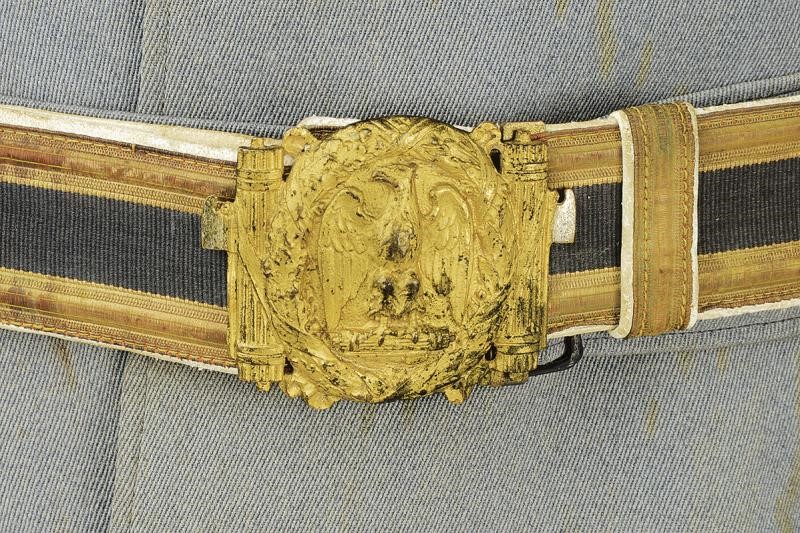Uniform consisting of alpine-style hat of grey-green wool with fine front eagle frieze of threads, black fabric band (defects), chevron and small roping of gilded threads; inside black sweat band. Single-breasted, grey fabric jacket, complete with gold-coloured metal shoulder boards from Consul General with eagle on fasces. Lapel with black flames surmounted by metal fasces. On the breast three rows of bars. Complete with stripes on the sleeve. All buttons present, decorated in relief with Savoy eagle on fasces. Grey and white fabric lining. The jacket has a few stains and small defects. Complete with leather belt covered with gilded threads and black fabric band, large gilt brass buckle representing a Savoy eagle on fasces in an oak wreath.