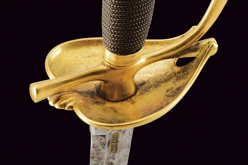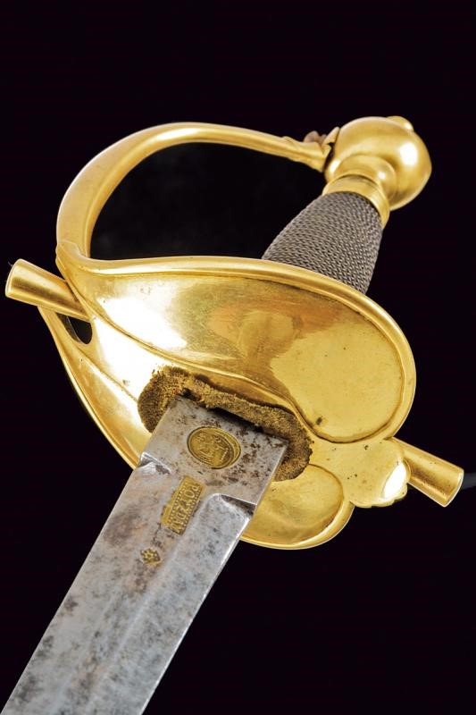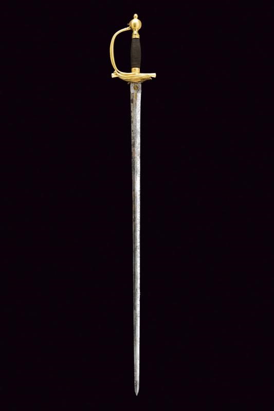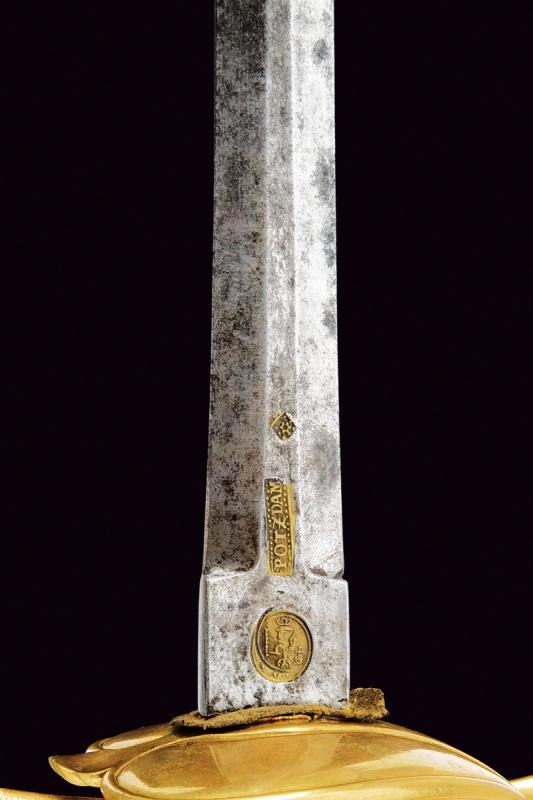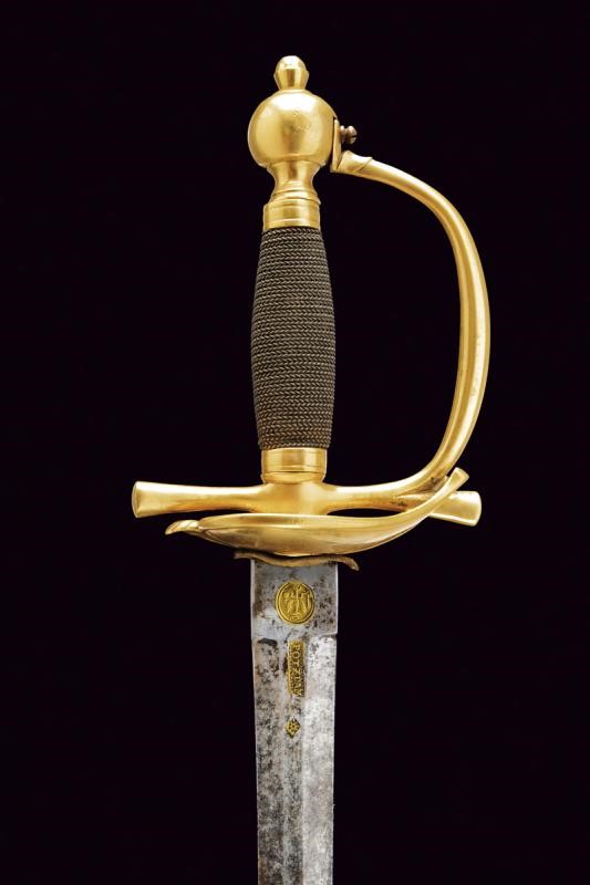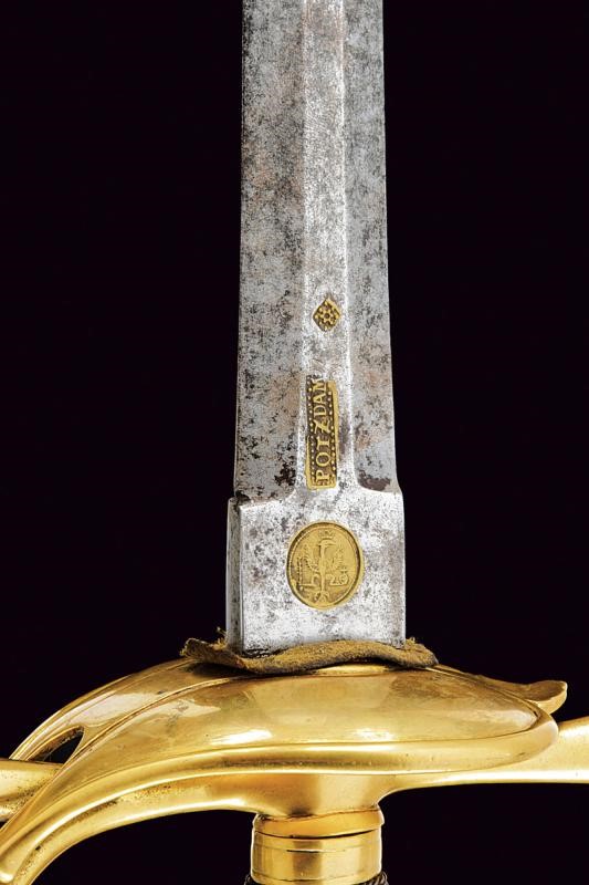Beautiful, straight, double-edged blade of hexagonal section, at the base mark and stamp "POTZDAM", both brass-inlaid; tang with Prussian eagle mark within a circle, also brass-inlaid. Gilt brass hilt, heart-shaped rain guard, smooth guard. Spherical pommel. Grip covered with copper wire binding.