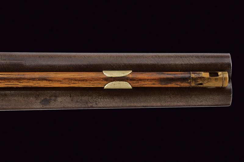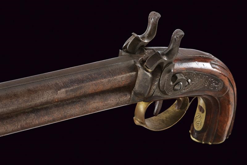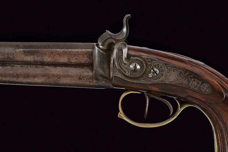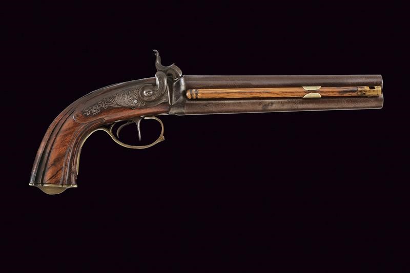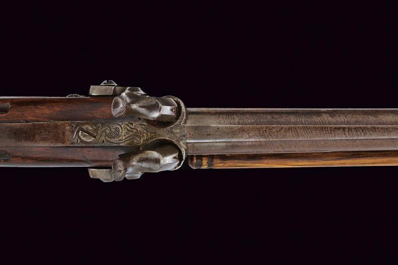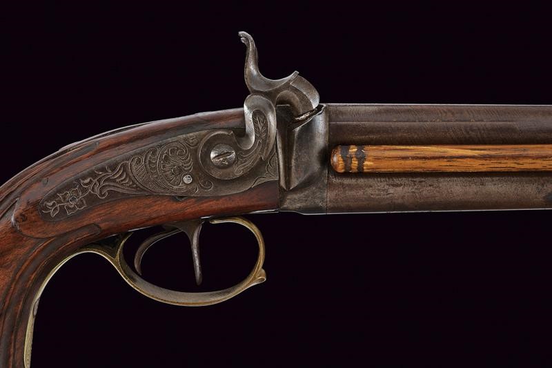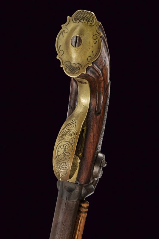 Smoothbore, round, damask, 13 mm cal. barrels, the upper part with rib, the lower part marked ‘PIETRO BERETTA / GARDONE’. Long tang, the area near the cocks is engraved. Backward percussion spring lock with flat lock plates engraved with floral motifs. Wooden, half stock sculpted with grooves following the curving. Brass mounts engraved en suite with the ramrod. Brass-tipped wooden ramrod.