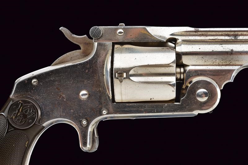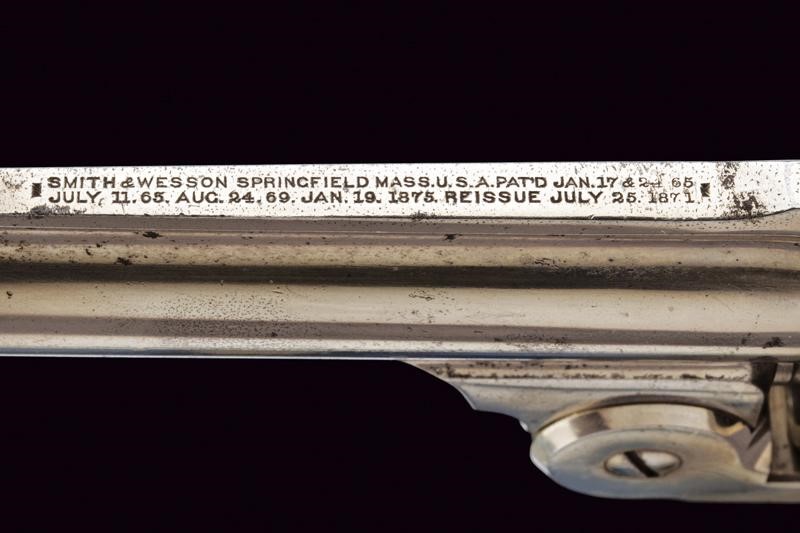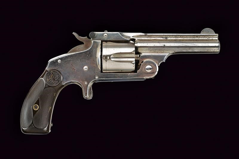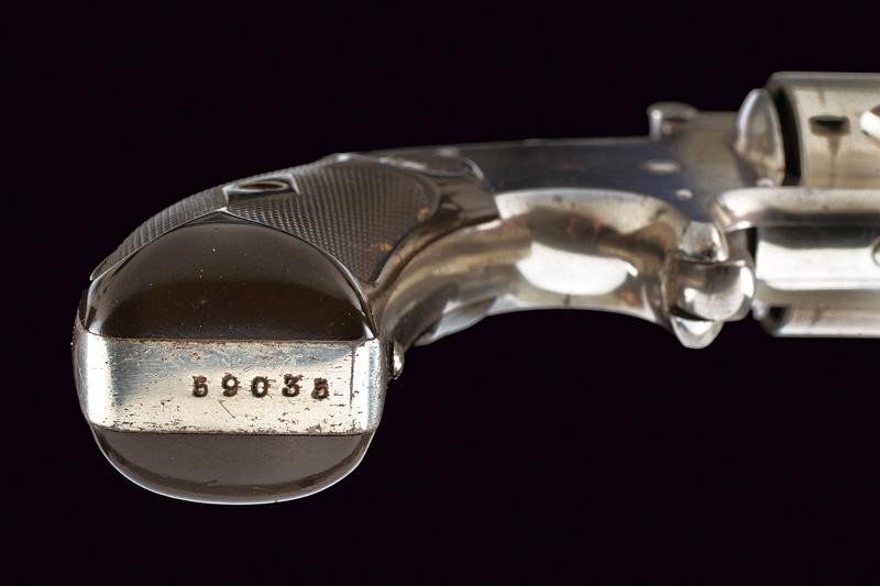 Rifled, 38 S&W cal barrel (visible rifling), provided with high rib with company address and patents in two lines. Grooved, five-shot cylinder. Well working mechanism. Spur trigger in the frame. Fine, 90% nickel plating, probably antique. Serial number ‘59xxx’ under the grip. Checkered, hard rubber grip scales with embossed ‘S&W’.