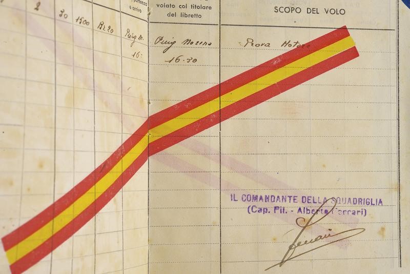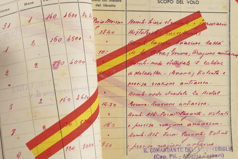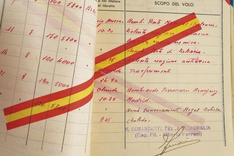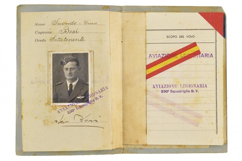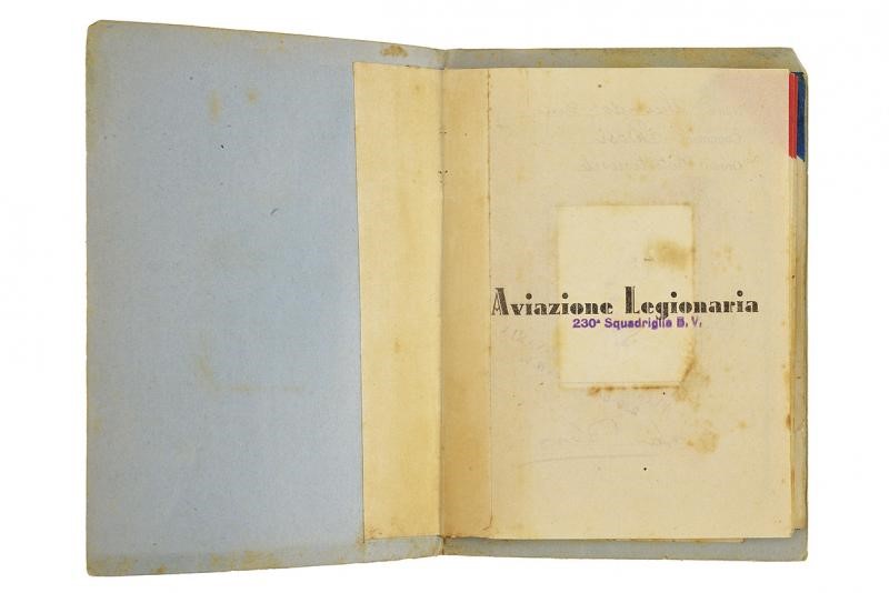 The cover with the coat of arms and inscription "Aviazione Legionaria 230a Squadriglia B. V. Personal flight booklet s.Lt. Bosi". Inside, photos in aviation uniform and three pages with 16 flights from 31/1 to 27/3 with descriptions of actions such as bombing raids etc.