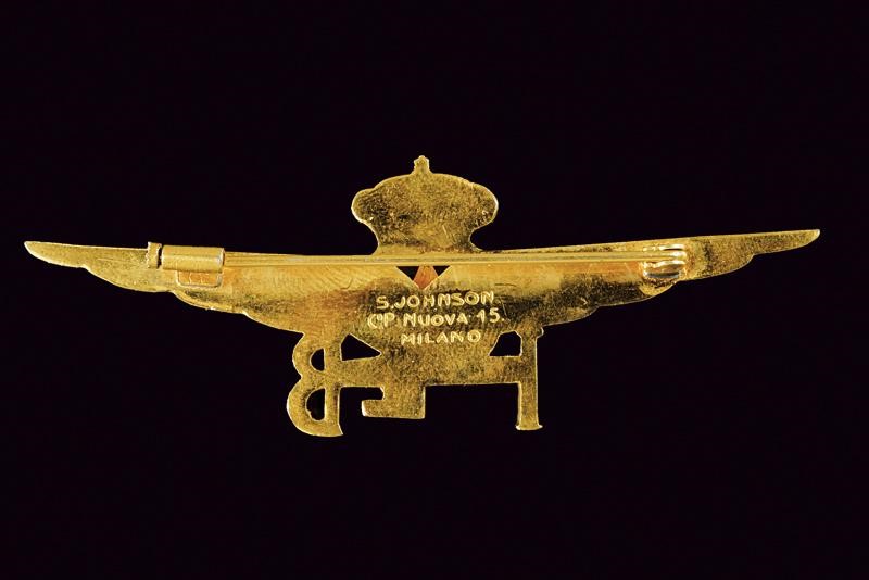 Very rare ‘Atlantic Flyer’ patent made of gilded metal, on the front an eagle with the blue-enameled letter ‘A’ above, below the letters ‘I B’ linked by a bundle; marked ‘S. JOHNSON CP NUOVA 15 MILANO’ on the back.