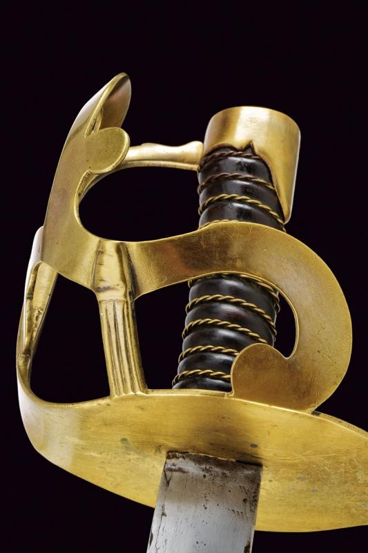 Flat, straight, single-and short false-edged blade. Brass mounts, loop-guard with spirals (“fleurons”), fasces with Phrygian cap welded between loop-guard and rain-guard, the distinctive cockerel mark is imprinted on the guard plate. Leather-covered wooden grip (small defects) with brass wire binding. Brass cap. Leather scabbard with brass mounts, two iron suspension rings. Interesting.