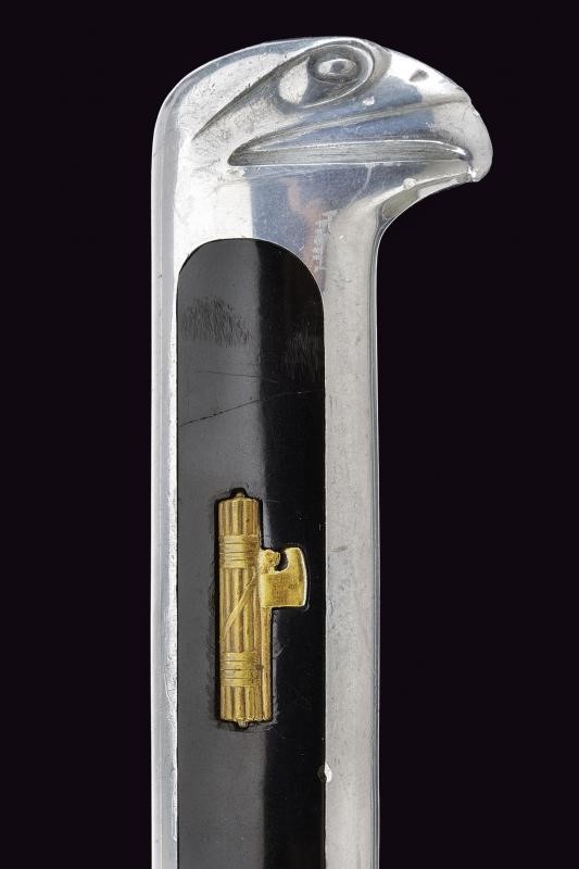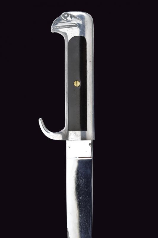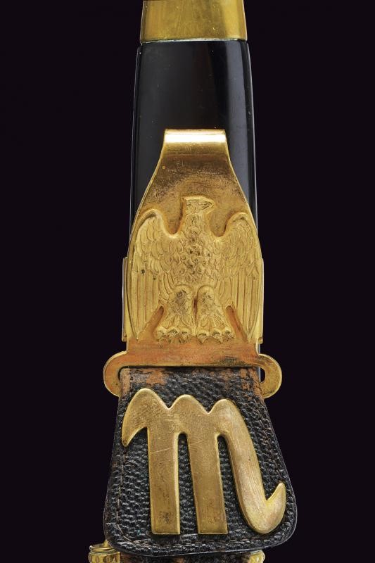 Well-preserved blade. Aluminium grip with small pitting. Black-coloured grip scales with brass fasces. Metal scabbard with black paint, mounts decorated with mini studs featuring remains of gilding. Complete with rare leather clutches with eagle hook and a large "M" frieze.