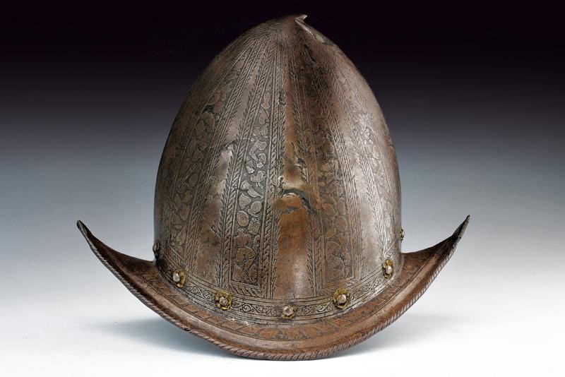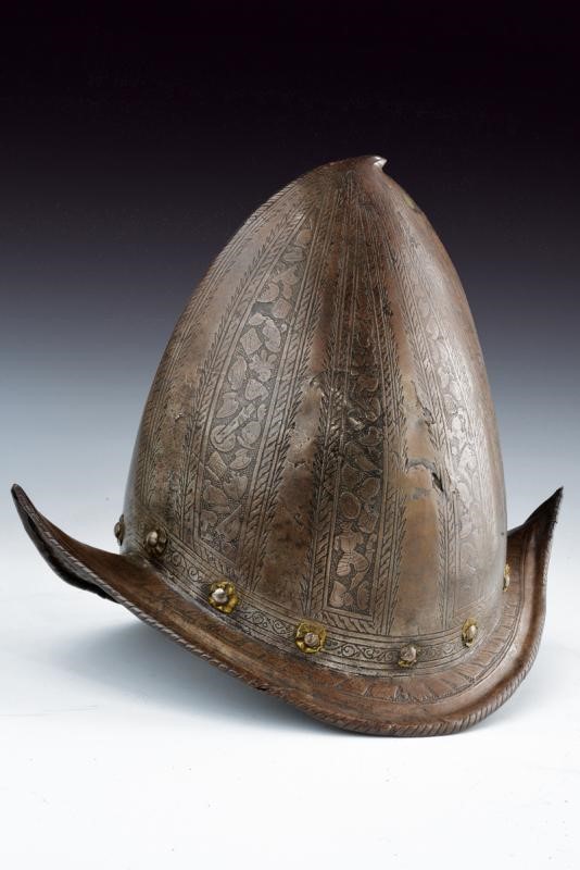 Tall skull worked in one piece, provided with a cusped top turned backwards; sloping brim, pointed, ribbed and with rebated margin and roped border; the whole surface engraved with bands featuring parts of armour, weapons, grotesque figures and musical instruments, all on a dark granulated background. Some restorations. A row of iron rivets and brass rosettes at the base.