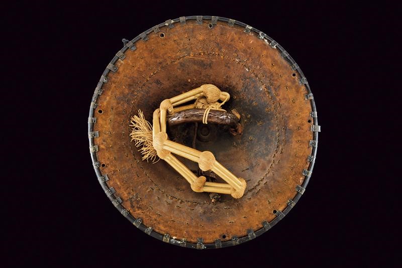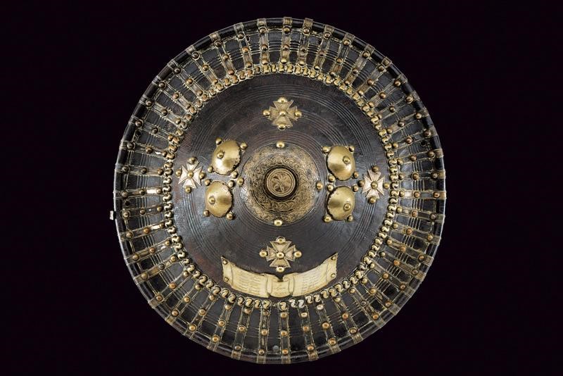 Made of heavy boiled leather, round with strongly raised centre and roped borders; very rich silver mounts (small missing parts) partially engraved with floral and geometric motifs, the centre surrounded by crosses and studs, with birds' heads and bands on the border stopped by three rivets, on one side a silver bandeau engraved in the centre and dated "4 April MCMXX", names of fifteen officers of an Italian regiment on the sides (of the bandeau). Provided with a large gripping ring and with an officer's roper. Rare with these decorations and inscriptions.