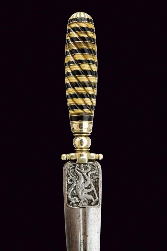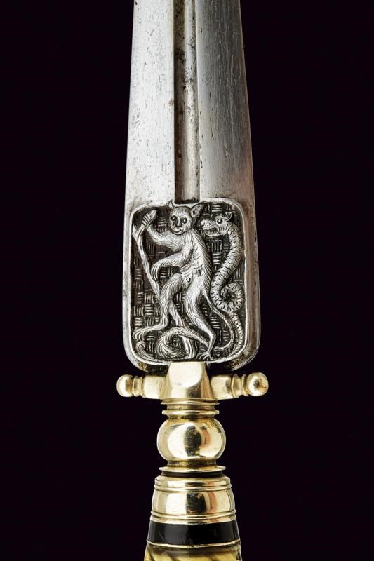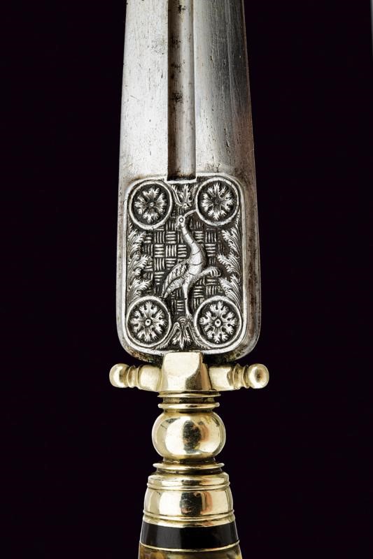 Straight, double-edged blade, with fuller at the centre, featuring fine bas-relief depictions on the tang: on one side a monkey and a snake, on the other a bird resembling an ibis. The background of both images worked with carved knots, the ibis also with rosettes. White metal quillon, knot and ferrule. Twisted handle consisting of sections made of brown and light horn alternating with metal foils. White metal cap. Wooden scabbard lined with velvet (worn) and featuring brass mounts.