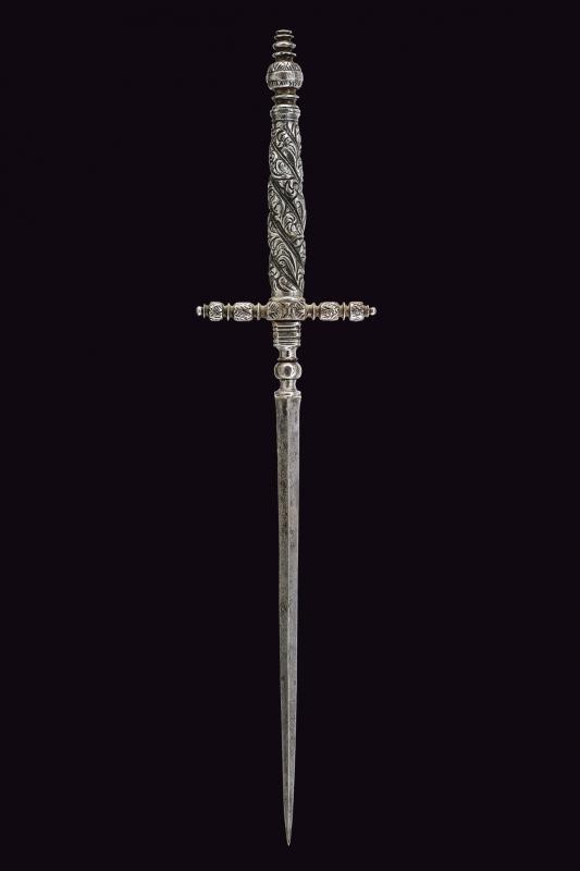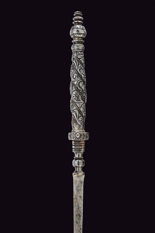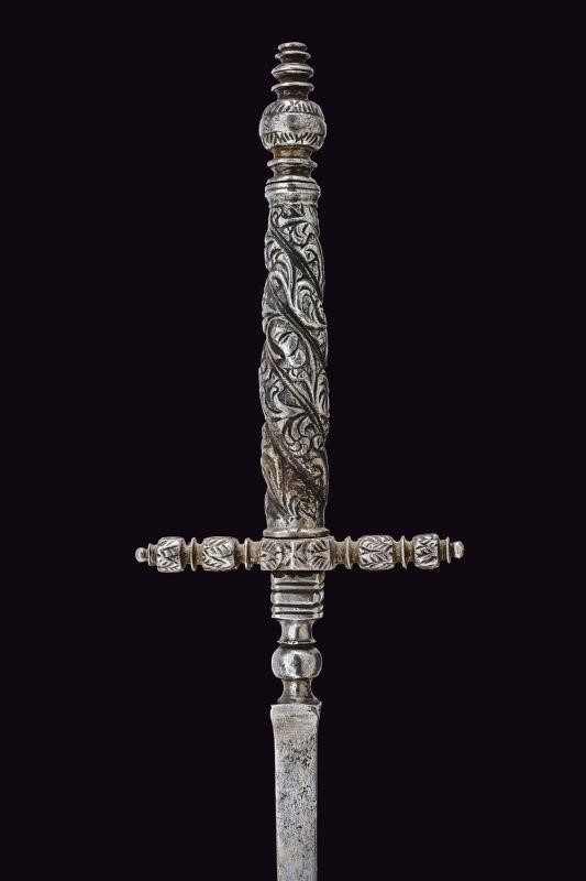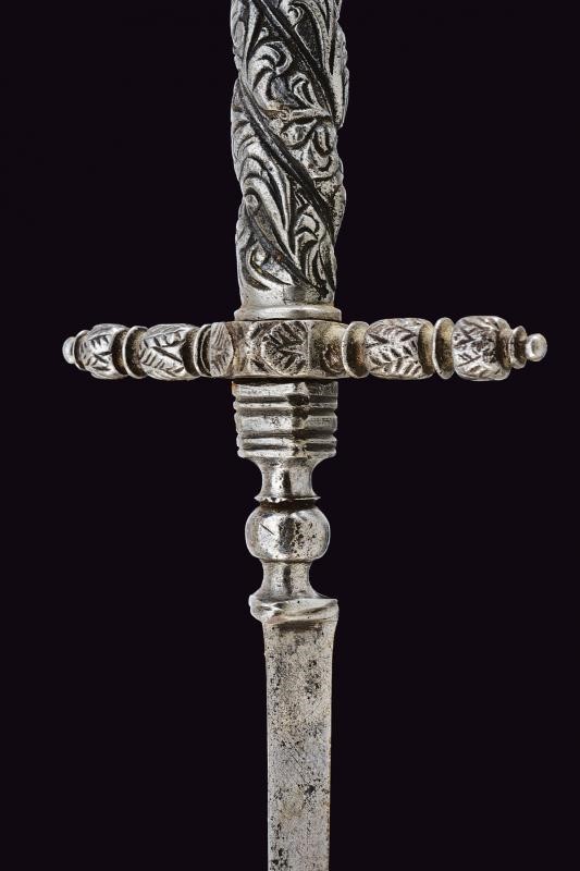 Straight blade of triangular section with carved knot. Solid iron hilt richly carved with floral motifs.