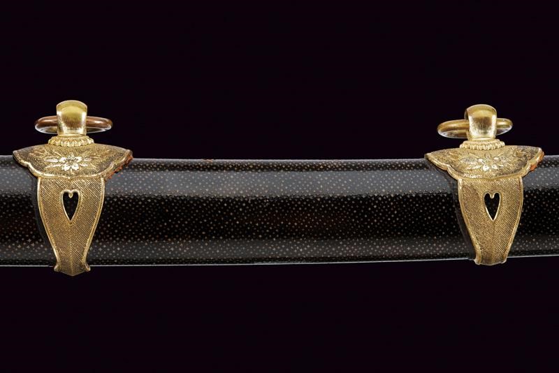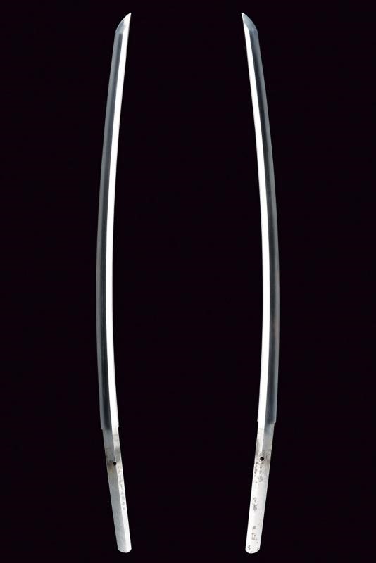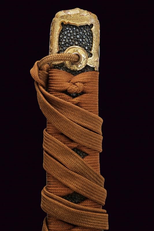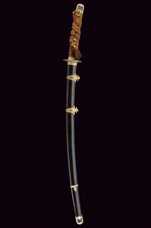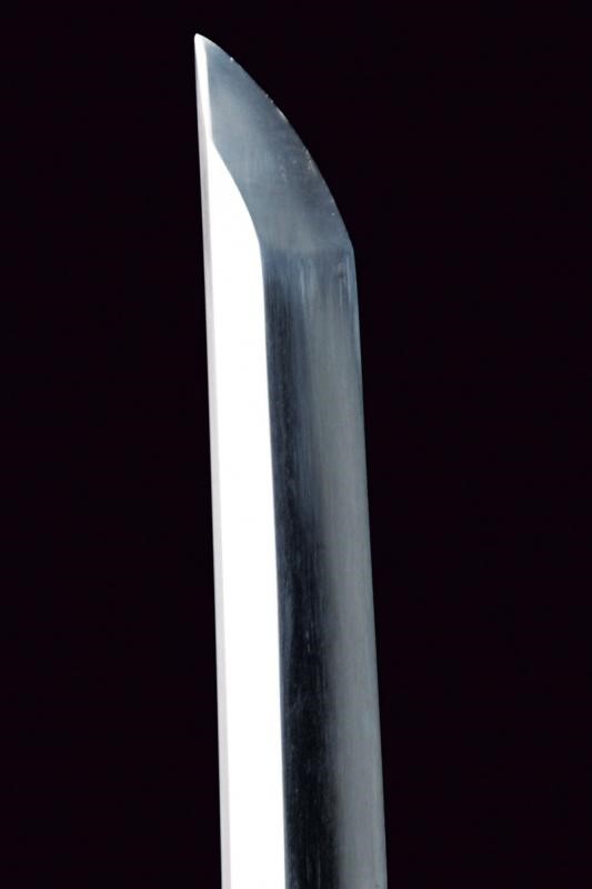 Shinogi zukuri blade (Nagasa: 66.7 cm); hamon: suguha; hada: muji. Nagako mei not fully legible "1939 A lucky day forged from special steel ....", a mekugi-ana. Silver-plated copper habaki. Typical koshirae kai-gunto in perfect condition.