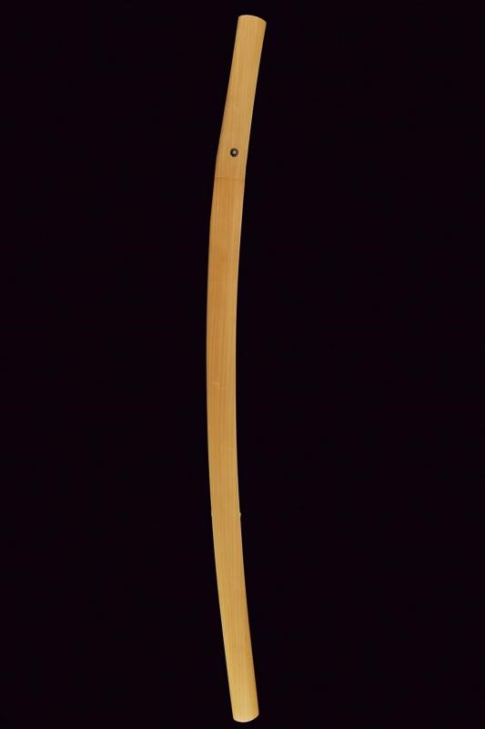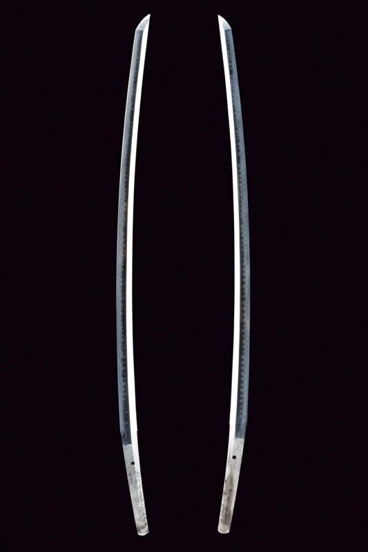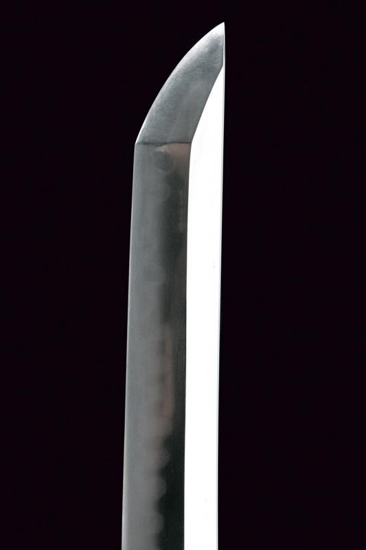 Blade with 78.5 cm nagasa; hamon: midare; hada: mokume. Nakago mei: Minamoto Kiyotsugu Saku. Copper habaki. In shirasaya.