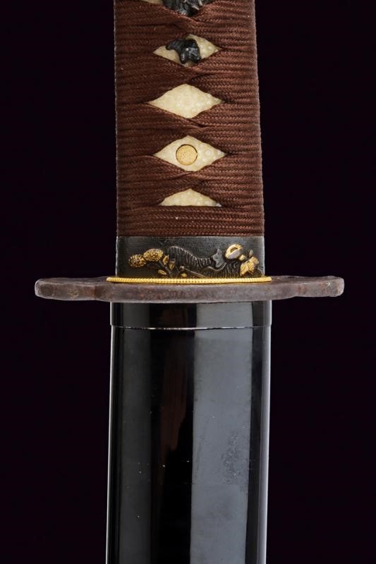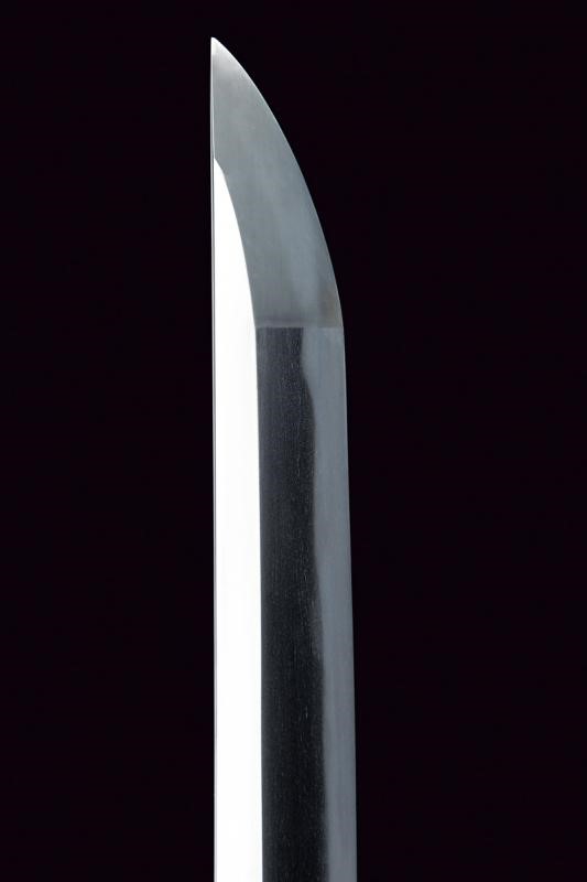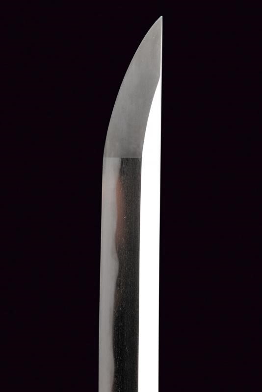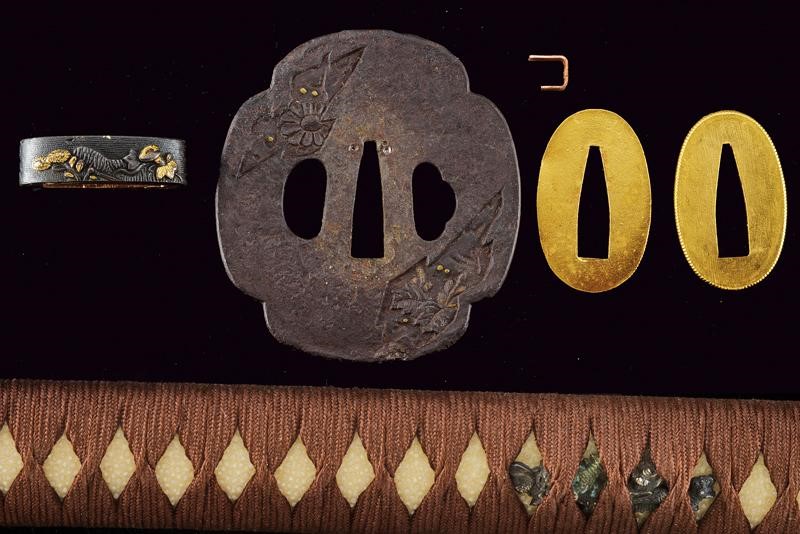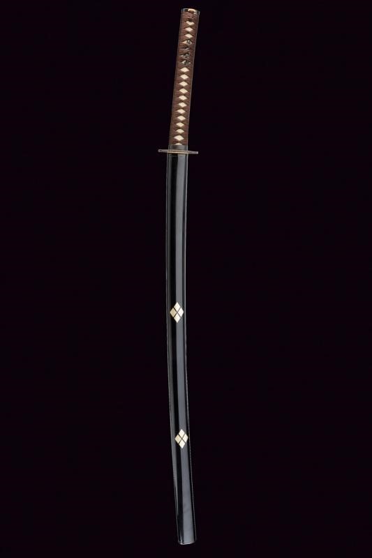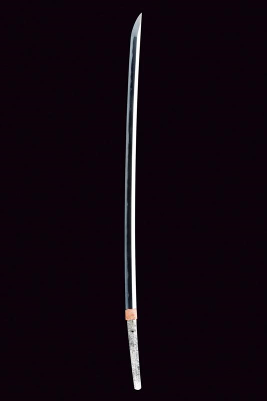 Blade with 79.5 cm nagasa blade; hamon: suguha-notare; hada: mokume. Nakago mei: Zuisenshi Nobuide Saku. Copper habaki. Koshirae with tsunami mokko with floral engravings and small yellow metal decorations. Fuchi with floral motifs partially remade in gold, kashira in black horn; long menuki. Saya in black lacquered wood with mon in gold. Showa period with modern koshirae.