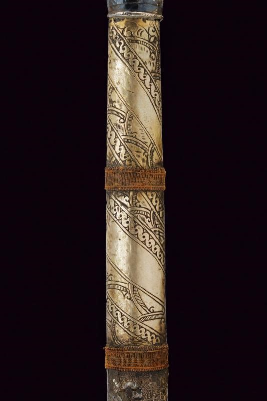 Straight, double-edged, smoothbore blade grooved on its entire length, carved at the base. Ukiran made of sculpted wood. Selut made of finely engraved brass. Wooden warangka with gandar fully covered with two types of silver foil (small damaged elements and missing parts) engraved with floral and geometric motifs, with threads bands and earlier fabric.
