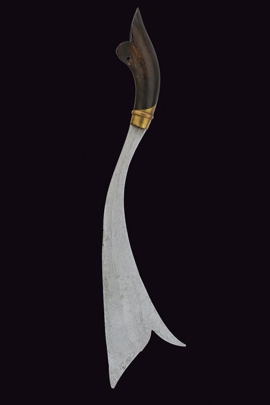 Beautiful, curved, single-edged blade of fine pamor strongly rising towards the double tip. Sculpted horn grip and brass ring nut.